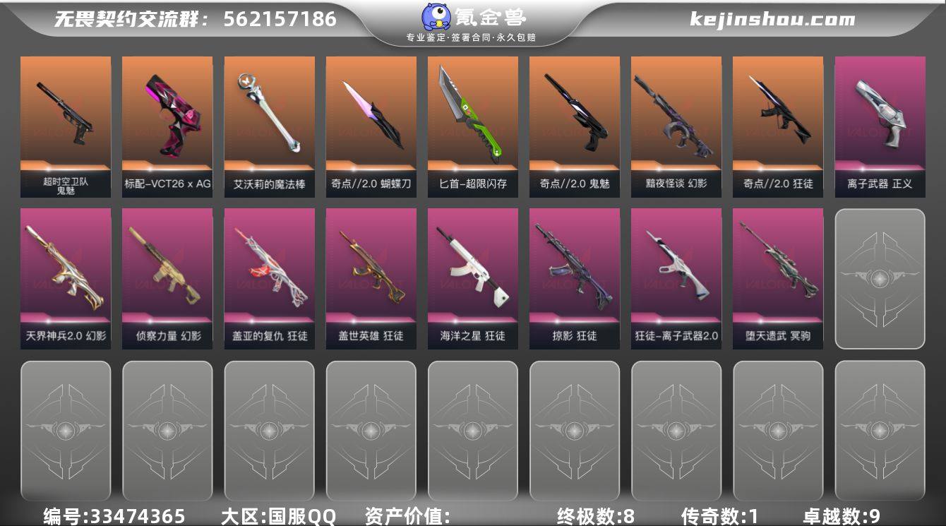 w5308 【精品号】超时空鬼魅 盖亚双刀 仙女棒 弃王大狙 ag标配 侦查幻影 盖亚狂徒 猴子狂徒 离子狂徒 天界幻影 黯夜怪谈幻影 掠夺狂徒 奇点狂徒 奇点蝴蝶刀 奇点鬼魅 离子正义 鱼缸狂徒 库存: 29100剩余VP:152剩余R点:105 段位:钻石2历史最高:超凡1