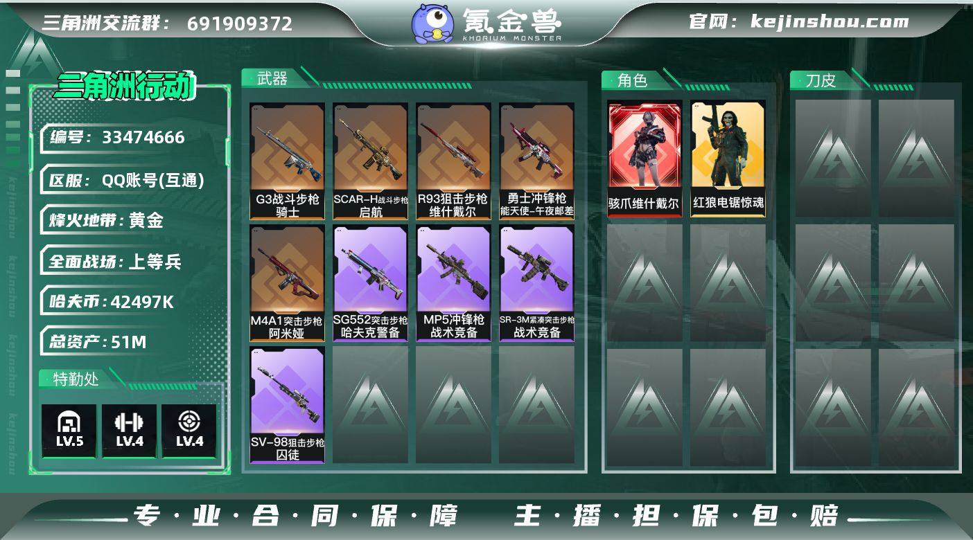【LSJX871】51m总资产-42497k哈夫币-41烽火等级-黄金-14战场等级-上等兵 【干员外观】:骇爪-维什戴尔,红狼-电锯惊魂 【近战皮肤】:近战-黑鹰 【传说外观】:M4A1突击步枪-阿米娅,SCAR-H战斗步枪-启航,G3战斗步枪-骑士,勇士冲锋枪-能天使-午夜邮差,R93狙击步枪-维什戴尔 【史诗外观】:SG552突击步枪-哈夫克警备,MP5冲锋枪-战术竞备,SR-3M紧凑突击步枪-战术竞备,SV-98狙击步枪-囚徒 【稀有外观】:M4A1突击步枪-零点,AKM突击步枪-肃杀,QBZ95-1突击步枪-公平竞技,K416突击步枪-碳纤维,M7战斗步枪-捣蛋鬼,SG552突击步枪-贴花艺术,SCAR-H战斗步枪-荣耀列队,MP5冲锋枪-弄臣,MP5冲锋枪-哈夫克卫队,P90冲锋枪-黄昏,P90冲锋枪-捣蛋鬼,Vector冲锋枪-先锋,UZI冲锋枪-亚特兰蒂斯,SMG-45冲锋枪-行动开启,M249轻机枪-冰天雪地,Mini-14射手步枪-荣耀列队,SVD狙击步枪-战术行动,SV-98狙击步枪-星链科技,SV-98狙击步枪-哈夫克航天,SV-98狙击步枪-精英联盟,G18-星链科技,G18-哈夫克航天 【普通外观】:SKS射手步枪-彩墨涂鸦,M4A1突击步枪-粉色涂装,M4A1突击步枪-高雅黑,QBZ95-1突击步枪-高雅黑,QBZ95-1突击步枪-海浪,QBZ95-1突击步枪-2026,腾龙突击步枪-...