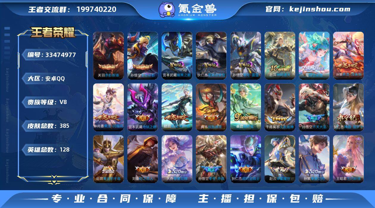 实名: 可修改 贵族等级: V8 英雄数: 128 皮肤数: 385 荣耀水晶: 全息碎影,赤影疾锋 星传说: 幽冥之眼,零号·雷霆,星际治安官 传说皮: 黄金射手座,久胜战神,地狱火,零号·赤焰,地狱之眼,乞巧织情,时之恋人-刘备,淬星耀世,超时空战士-狄仁杰,挚爱之约,挚爱花嫁,神器·狴犴令,乘龙·问璇玑,乘龙·铭钟鼎,乘龙·淬吴钩,典韦战鼓燎原,神树通天 限定皮: 遇见飞天,李小龙,梁祝,辉光之辰,白晶晶,至尊宝,一生所爱,大圣娶亲,高山流水,孙行者,猪悟能,时之祈愿-云中君,时之祈愿-瑶,百木心枪,唐三藏,五谷丰年,齐天大圣,鸣野蒿