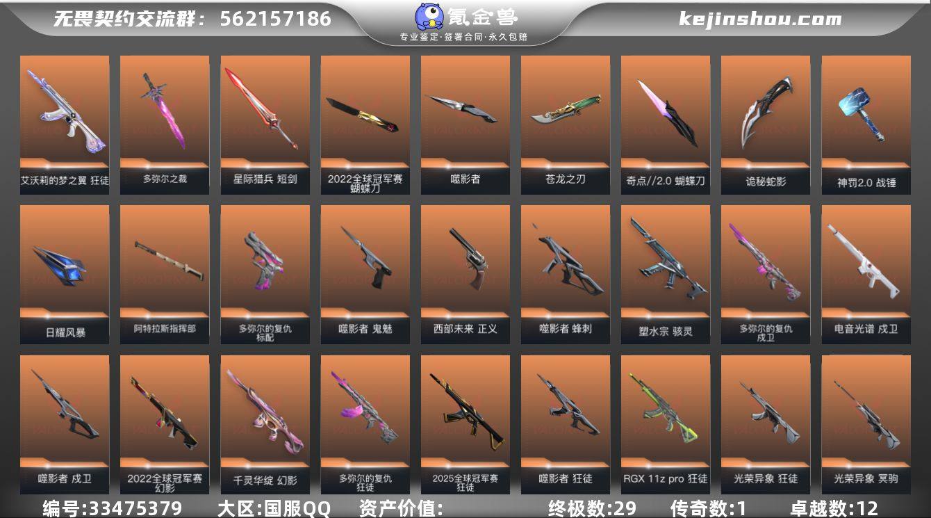 【958040】【套装】:2022全球冠军赛套装,多弥尔的复仇套装,噬影者套装,掠影//2.0套装 【英雄】:幻棱,炼狱,维斯,暮蝶,钛狐,壹决,铁臂,捷风,雷兹,幽影,不死鸟,贤者,猎枭,蝰蛇,零,芮娜,奇乐,尚勃勒,霓虹,斯凯,夜露,星礈,K/O,海神,盖可,黑梦,钢锁 【近战武器】:近战武器-2022全球冠军赛 蝴蝶刀,近战武器-碎心裂刃,近战武器-多弥尔之裁,近战武器-影钩,近战武器-5周年//公测重制版 苍龙之刃,近战武器-奇点//2.0 蝴蝶刀,近战武器-噬影者 簇刃,近战武器-诡秘蛇影 军刀,近战武器-神罚//2.0 战锤,近战武器-日耀风暴 遗器,近战武器-阿特拉斯指挥部 甩棍,近战武器-星际猎兵 短剑 【狂徒】:狂徒-2025全球冠军赛,狂徒-噬影者,狂徒-RGX 11z Pro,狂徒-光荣异象,狂徒-多弥尔的复仇,狂徒-艾沃莉的梦之翼,狂徒-堕天遗武,狂徒-起源,狂徒-诡秘蛇影,狂徒-极简主义//2.0,狂徒-神罚//2.0 【幻影】:幻影-2022全球冠军赛,幻影-千灵华绽,幻影-侦察力量,幻影-异鳞魔蛇,幻影-海洋之星//2.0,幻影-掠影//2.0,幻影-末日之翼 【戍卫】:戍卫-噬影者,戍卫-电音光谱,戍卫-多弥尔的复仇,戍卫-折光棱晶,戍卫-电音光谱 【冥驹】:冥驹-光荣异象 【...