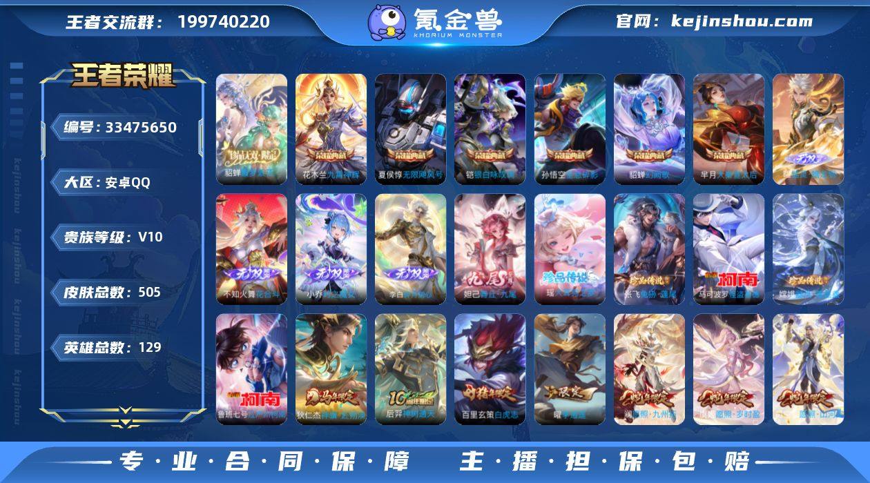 【王者荣耀】珍品无双1 典藏6 无双7 珍品传说6 传说79 史诗154 英雄129 皮肤505 贵族10级 珍品无双:馥梦繁花__荣耀典藏:无限飓风号|全息碎影|大秦宣太后|银白咏叹调|幻阙歌|九霄神辉__无双皮肤:群星魔术团|时之魔女|碎月剑心|真我赫兹|花合斗|器灵·螭龙剑|青丘·九尾__珍品传说:江户川柯南|怪盗基德|孙策-时之奇旅|器灵·落星盏|兔狲·蓬尾|大耳狗之梦__传说皮肤:鸣野蒿|枫霜尽|挚爱花嫁|挚爱之约|补天|绛天战甲|启明星使|胖达荣荣|地狱之眼|海洋之心|云霓雀翎|久胜战神|黄金狮子座|黄金白羊座|刘备-时之恋人|云鹰飞将|冠军飞将|李逍遥|游龙清影|炽翼辉光|电玩·雷克斯|浮生妄|鹤羽星尊|齐天大圣|白虎志|凤求凰|黄金天蝎座|惊梅引|兰陵王-默契交锋|零号·赤焰|落雪白狼|吕布-曦玄引|马超-琥珀纪元|怒海麟威|燃星之曲|霜月吟|太华|天魔缭乱|妄想实况|武陵仙君|武圣|项羽-无限倾心|小乔-音你心动|亚瑟-追逃游戏|永曜之星|虞姬-无限倾心|遇见神鼓|战鼓燎原|逐花归海|乘龙·淬吴钩|乘龙·铭钟鼎|乘龙·问璇玑|云缨-鹤归松栖|觅芳踪|山海·苍雷引|山海·炽霜斩|山海·琳琅生|神器·狴犴令|朵莉亚-心动手记|寅虎·赤拳|云中君-群星魔术团|灼幽烈阳|冥王哈迪斯|张飞-百相守梦|玄雷天君|幻光神枪|祥...