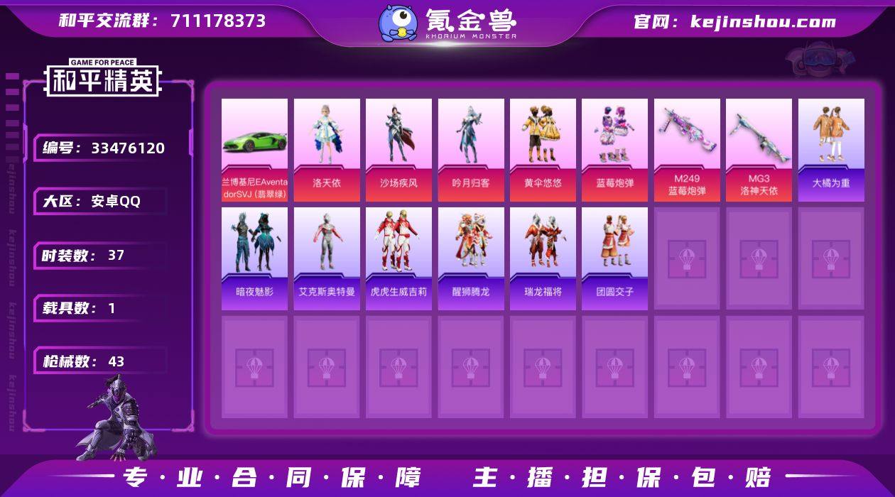 【958069】M1047130【女号1载具-5粉装-2特效枪黄伞悠悠,吟月归客,角色-洛天依,沙场疾风,蓝莓炮弹】安卓手Q-1载具-5粉装-2特效枪-37套装-43枪皮-1王牌印记-英勇黄金Ⅲ-20584热力值【1载具】兰博基尼Aventador SVJ(翡翠绿)【5粉装】黄伞悠悠,吟月归客,角色-洛天依,沙场疾风,蓝莓炮弹【2特效枪】MG3-洛神天依[4级],M249-蓝莓炮弹[4级]【1飞行器】火焰蝠人飞行服【1背包】神秘黑猫背包【73其它衣服和枪皮】爆裂葡萄,暗夜魅影,灰色格斗者,大橘为重,遗落祭司,SS18特训,角色-艾克斯奥特曼,角色-零款战斗服,虎虎生威吉莉,竞技名士,团圆交子,骑行爱好者,角色-薰款战斗服,瑞龙福将,冰爽风暴,SS21特训,天籁歌者,醒狮腾龙,怒火燎原,异彩先驱,冰川谧蓝,滨海假日,海龙战士,电音精灵,格斗先锋,甜蜜熊情侣,SS17特训,SS19特训,长空猛禽,特战装甲,霓虹极客,魅力单车,Mk47-洛神天依,M416-蓝色火焰,Kar98K-洛神天依,M416-暗星紫秘,GROZA-蓝莓炮弹,AKM-彩虹符号,Mk47-乌木金纹,GROZA-异彩先驱,AKM-龙的传人,GROZA-春暖花开,Mini14-异彩先驱,Vector-暗夜玫瑰,M762-彩虹甜喵,UMP45-海渊国主,AKM-霓虹街区,M762-瑞龙福将,SCAR-L-暗夜玫瑰,平底锅-异彩先驱,平底锅-绿意幻情,汤姆逊-炫彩节奏,MG3-瑞龙福将...