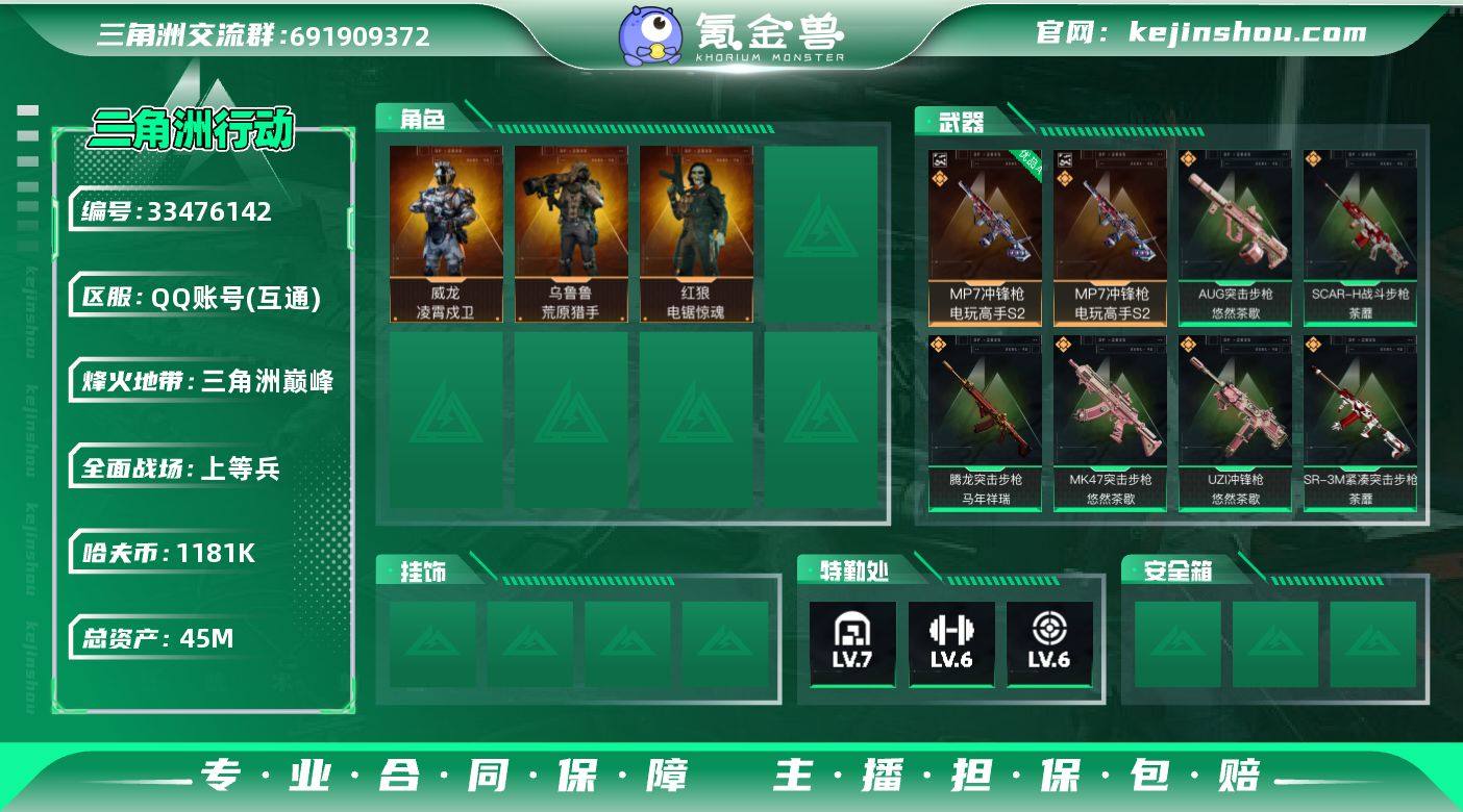 【958072】包人脸 玩够能回血 1红凌霄戍卫 sjs10950 45m总资产-1181k哈夫币-60烽火等级-三角洲巅峰-13战场等级-上等兵 【干员外观】:威龙-凌霄戍卫,红狼-电锯惊魂,乌鲁鲁-荒原猎手 【近战皮肤】:近战-黑鹰 【典藏外观】:MP7冲锋枪-电玩高手S2 【典藏外观成色】:MP7冲锋枪-电玩高手S2(优品A) 【传说外观】:QBZ95-1突击步枪-凌霄戍卫,AUG突击步枪-悠然茶歇,SCAR-H战斗步枪-启航,SCAR-H战斗步枪-荼蘼,AS Val突击步枪-蛇年祥瑞,腾龙突击步枪-马年祥瑞,腾龙突击步枪-万金泪冠,KC17突击步枪-电锯惊魂,MK47突击步枪-悠然茶歇,UZI冲锋枪-悠然茶歇,SR-3M紧凑突击步枪-荼蘼,勇士冲锋枪-万金泪冠,PKM通用机枪-荼蘼,M14射手步枪-蛮荒,R93狙击步枪-维什戴尔,AWM狙击步枪-万金泪冠,G18-马年祥瑞 【史诗外观】:K416突击步枪-冬日风情,K416突击步枪-腊梅,K416突击步枪-阿萨拉特攻,SCAR-H战斗步枪-囚徒,K437突击步枪-丛影谍踪,MP5冲锋枪-战术竞备,MP5冲锋枪-竞技风,SR-3M紧凑突击步枪-开工大吉,勇士冲锋枪-工业狂潮,勇士冲锋枪-丛影谍踪,MP7冲锋枪-六套之力,S12K霰弹枪-曙光,PKM通用机枪-阿萨拉特攻,M249轻机枪-丛影谍踪,QJB201轻机枪-炽焰,VSS射手步...