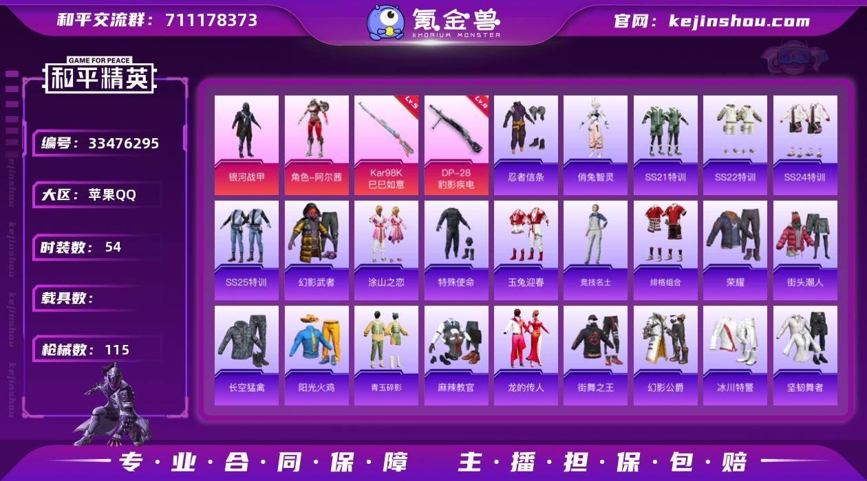 苹果 手Q-2粉装-5特效枪-0载具-0粉色飞行器-26803热力值-4王牌印记-54套装-115枪皮 【热门品类】:套装-忍者信条 【粉色套装】:粉装-银河战甲,角色-阿尔茜 【粉色枪皮等级】:ACE32-萌骑漫游(三级),AKS-74U-森灵之息(五级),Kar98K-巳巳如意(五级),Mk14-福马献瑞(五级),DP-28-豹影疾电(四级) 【粉色枪皮】:ACE32-萌骑漫游,AKS-74U-森灵之息,Kar98K-巳巳如意,Mk14-福马献瑞,DP-28-豹影疾电 【粉色降落伞】:幻影战神降落伞,百万伏特降落伞,银河战甲降落伞,环太平洋降落伞,飒粉甜心降落伞,喜羊羊与灰太狼降落伞 【稀有套装】:套装-雪国风尚,角色-幸运青,套装-马上有钱,套装-迅捷龙虾,角色-俏兔智灵,套装-雨过天青,套装-红釉青花 【稀有枪皮】:AKM-奇异狩猎者,AKM-破晓战魂,AKM-龙的传人,M16A4-幻世战舞者,M16A4-红色方程式,SCAR-L-玉兔迎春,SCAR-L-银河战甲,M416-红色方程式,M416-绯红前夜,GROZA-懵萌河马,GROZA-银河战甲,AUG-幻影战神,AUG-耀粉歌者,QBZ-银河战甲,M762-天降萌叽,G36C-懵萌河马,AC-VAL-天降萌叽,AC-VAL-彩虹甜喵,蜜獾-娇憨猪猪,UZI-天降萌叽,UZI-娇憨猪猪,UZI-幻影战神,UZI-红色方程式,UZI-月影灵韵,UMP45-涂山...