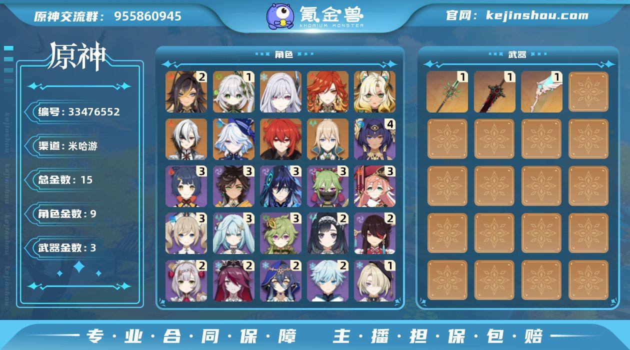 15黄!火神!丝柯克!仆人!芙宁娜!1命草神!二命迪希雅 一命纳西妲 迪卢克,琴,芙宁娜,阿蕾奇诺,希诺宁,玛薇卡,丝柯克 拥有武器: 狼的末路,天空之翼,和璞鸢 1精武器: 狼的末路,天空之翼,和璞鸢