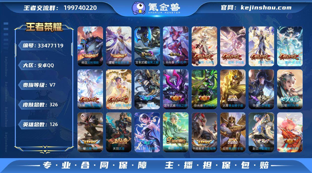 【蛇年限定全套】实名: 可修改 贵族等级: V7 英雄数: 126 皮肤数: 326 荣耀水晶: 弑枪猎影,神鉴启示录 星传说: 未来机甲,幽冥之眼 传说皮: 黄金狮子座,黄金射手座,云鹰飞将,久胜战神,一念神魔,末日机甲-孙尚香,地狱之眼,淬星耀世,鹤归松栖(云缨),牧神诗旅,星之鸣奏 限定皮: 冰锋战神,遇见飞天,李小龙,游园惊梦,梁祝,武圣,高山流水,孙行者,五谷丰年,山海·玄木吟,夏侯惇霜北刀,鸣野蒿,愿照·千秋盛,愿照·众生和,愿照·山河定,愿照·岁时盈,愿照·福禄聚,愿照·九州拓