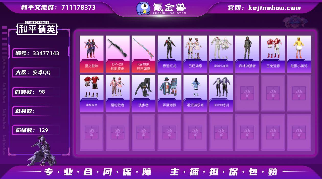 【958169】M1047245【地铁满天赋身法号1粉装-7特效枪 深海小丑鱼】安卓手Q-1粉装-7特效枪-98套装-129枪皮-3王牌印记-卓越王牌6星-32079热力值【1粉装】星之彼岸【7特效枪】DP-28-豹影疾电[5级],Mk14-福马献瑞[5级],AA12-G-萌骑幻想[5级],Kar98K-巳巳如意[5级],AKS-74U-森灵之息[4级],UMP45-萌骑冒险[3级],ACE32-萌骑漫游[2级]【1稀有】深海小丑鱼【8飞行器】顶峰精英尾迹,马上有福飞行器,炫彩糖果飞行器,鸡智如我飞行器,异域银装飞行器,狂鲨锋刃飞行器,破刃行动尾迹,登顶巅峰飞行器【218其它衣服和枪皮】绯格组合,蓝彩潮人,恋语绒绒,顶瓜瓜,猛禽,阳光火鸡,弄潮海豚,漫步者,雨过天青,SS34特训,SS28特训,狂鲨锋刃,萌鸡速递,破晓战魂,完美偶像,破蛋小黄鸡,巳巳如意,竞技达人朋克,潮流炫酷,霓虹街区,蝶变,超能元气,特训学院,青春校园,猎鹰,长空猛禽,龙魂突击队,蓝色运动,大橘大利,星梦畅游,湖蓝色名流,雪国风尚,竞技名士,异域银装,魅力单车,幻世战舞者,街头潮人,狙击之神,福星高照,深蓝色名流,幻世保卫者,SS35特训,冰河战士,漫游都市,海盐绵绵冰,薄荷星砂,粉黛兰香,元气之梦,酒红色名流,福马献瑞,SS33特训,青翼流星,街头风暴,马上有钱,旭日情侣,玉兔迎春,幻影武者,智谋强哥,星渊小...