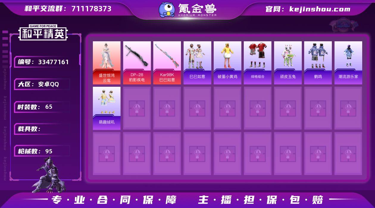 【958174】M1047182【盛世惊鸿-云鸾[3级]1神装-1粉装-4特效枪 虹云熊熊】安卓手Q-1神装-1粉装-4特效枪-65套装-95枪皮-3王牌印记-荣耀皇冠Ⅰ-25125热力值【1神装】盛世惊鸿-云鸾[3级]【1粉装】角色-虹云熊熊【4特效枪】DP-28-豹影疾电[5级],Kar98K-巳巳如意[4级],UMP45-萌骑冒险[4级],Mk14-福马献瑞[3级]【1稀有】AKM-缤纷海域【9飞行器】登顶巅峰飞行器,马上有福飞行器,狂鲨锋刃飞行器,云梦轻舟飞行器,炫彩糖果飞行器,云朵驼驼飞行器,鸡智如我飞行器,灵珠游龙飞行器,异域银装飞行器【153其它衣服和枪皮】游乐,炫彩糖果,绯格组合,SS36特训,黄色运动,霓虹热舞,白熊同盟,人气偶像,SS32特训,暗金炫舞,雪国风尚,湖蓝色名流,大橘大利,街头风暴,破蛋小黄鸡,魅力单车,马上来财,萌趣绒叽,巳巳如意,破晓战魂,海岛探路者,SS37特训,天籁歌者,酒红色名流,白色伏地魔,幻世战舞者,SS35特训,玲珑侠影,雨林探路者,SS34特训,电音精灵,雨过天青,街头潮人,旭日情侣,蓝色运动,军械专家,SS33特训,粉黛兰香,海盐绵绵冰,红色运动,长空猛禽,薄荷星砂,缤纷果语,顽皮玉兔,红釉青花,云魄琉璃,萌鸡速递,猛禽,元气之梦,柠萌假日,黑色伏地魔,异域银装,青翼流星,鹤鸣,角色-无面战甲,玩偶服-喜羊羊,福马献瑞,竞技...