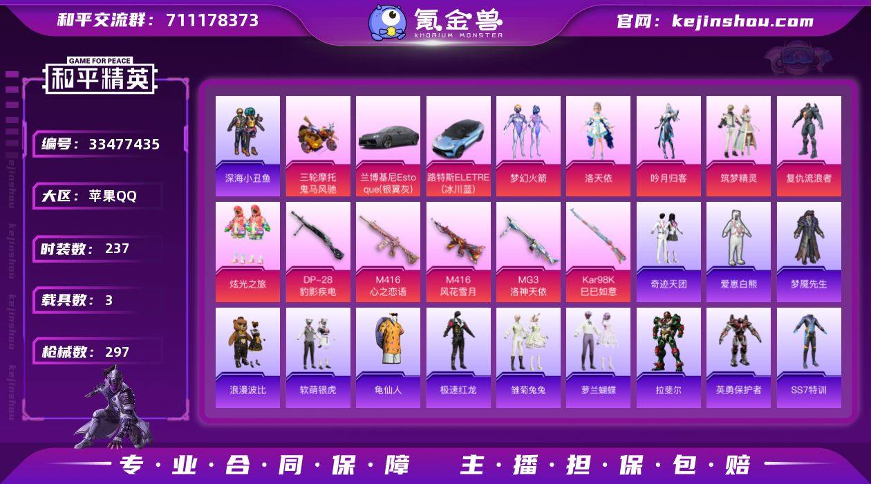 【958228】M1047529【4载具-6粉装-8特效枪 梦幻火箭 洛天依 小丑鱼 风花雪月[7级]复仇流浪者】苹果手Q-4载具-6粉装-8特效枪-237套装-297枪皮-19王牌印记-超级王牌3星-97553热力值【4载具】蔚蓝之翼 兰博基尼Estoque(银翼灰),路特斯ELETRE(冰川蓝),鬼马风驰【6粉装】角色-洛天依,梦幻火箭,炫光之旅,吟月归客,筑梦精灵,角色-复仇流浪者【8特效枪】MG3-洛神天依[7级],Kar98K-巳巳如意[4级],M416-心之恋语[7级],Mk14-福马献瑞[5级],DP-28-豹影疾电[5级],AKS-74U-森灵之息[4级],UMP45-萌骑冒险[2级],M416-风花雪月[7级]【2稀有】小丑鱼,汤姆逊-奇异狩猎者【6飞行器】霓虹街区飞行器,空岛之星尾迹,破刃行动尾迹,梦幻火箭飞行器,粉色滑翔尾迹,风花雪月飞行器【1头盔】梦幻火箭头盔【5背包】金风玉露背包,马卡龙背包,梦幻火箭背包,百万伏特背包,古堡领主背包【518其它衣服和枪皮】极速竞梦,猎梦纪元,SS32特训,猛禽,机械征服者,幻影武者,麻辣教官,时空追击者,空岛之星,破晓战魂,探宝勇士,SS24特训,绮丽涂鸦,SS25特训,香桃花海,竞技勇士朋克,蜜露汐语,坚韧舞者,SS34特训,白熊同盟,战术大师,原初圣火,核芯基因,团圆交子,福星高照,音速流光,爱崽白熊,幻世战舞者,SS15特训,蓝调潮人,缤纷果...