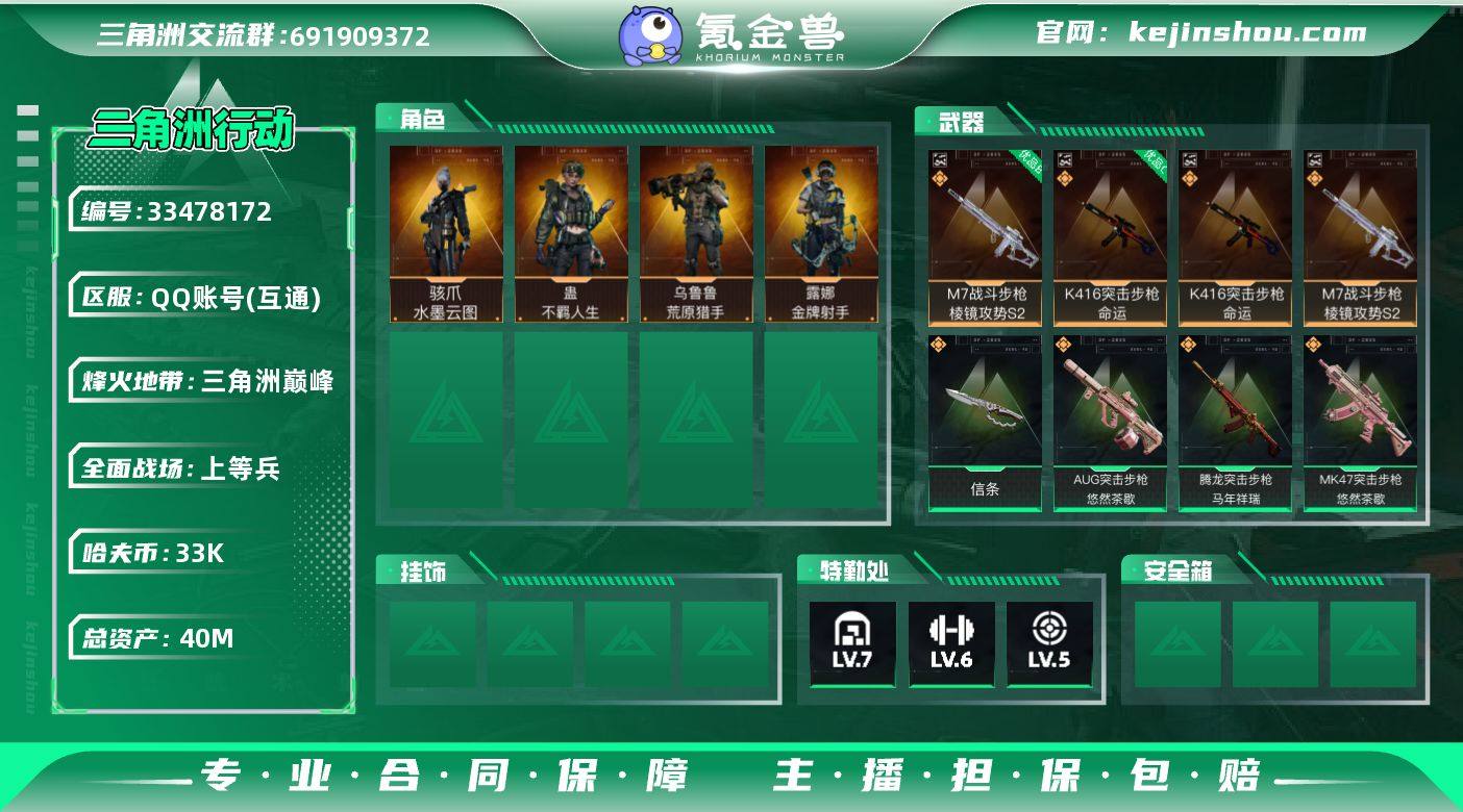 总资产40M/哈夫币3万/传说近战数1/传说枪皮数18/战场等级19/行动等级60/安全箱等时效性道具以游戏内数据为准,详情请看图/骇爪-水墨云图/露娜-金牌射手(S7)/乌鲁鲁-荒原猎手/蛊-不羁人生/近战-信条/近战-黑鹰/K416突击步枪-命运/M7战斗步枪-棱镜攻势S2/优品C典藏武器外观-K416突击步枪-命运/优品B典藏武器外观-M7战斗步枪-棱镜攻势S2/AUG突击步枪-悠然茶歇/SG552突击步枪-运动员/SCAR-H战斗步枪-水墨云图/SCAR-H战斗步枪-启航/腾龙突击步枪-马年祥瑞/MK47突击步枪-悠然茶歇/P90冲锋枪-信条/UZI冲锋枪-悠然茶歇/SR-3M紧凑突击步枪-荼蘼/M14射手步枪-蛮荒/M14射手步枪-缄花/SKS射手步枪-骑士/SR-25射手步枪-信条/SR-25射手步枪-缄花/.357左轮-缄花/G18-马年祥瑞/MP7冲锋枪-原型机(典藏)/SVD狙击步枪-檀劫铳影/K416突击步枪-冬日风情/K416突击步枪-腊梅/K416突击步枪-阿萨拉特攻/M7战斗步枪-百步穿杨/G3战斗步枪-流沙送葬/G3战斗步枪-哈夫克警备/AS Val突击步枪-百步穿杨/腾龙突击步枪-猎鳄行动/K437突击步枪-丛林谍踪/MP5冲锋枪-竞技风/Vector冲锋枪-猎鳄行动/Vector冲锋枪-百步穿杨/SMG45冲锋枪-阿萨拉特攻/SR-3M紧凑突击步枪-开工大吉/勇士冲锋枪-深海恐惧/勇士冲锋枪-丛林谍...
