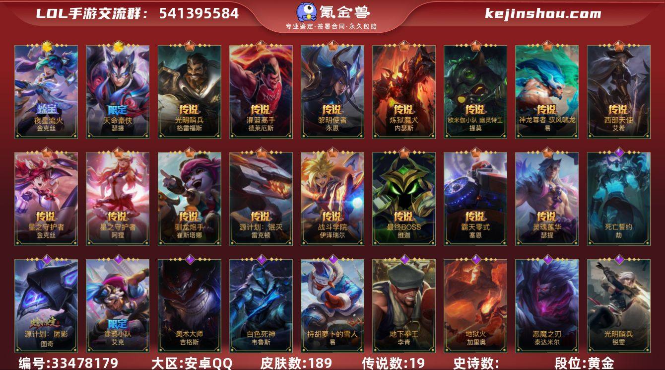 MLL1470【可二次 3神话 19传说 82史诗】安卓Q-英雄136-皮肤189-传说19 段位:黄金【神话】天命豪侠瑟提 夜星流火金克丝 流光仙韵莫甘娜【传说】神王德莱厄斯 源计划:泯灭雷克顿 神龙尊者驭风啸龙易 灌篮高手德莱厄斯 源计划:毁灭派克 战斗学院伊泽瑞尔 斗魂觉醒莎弥拉 西部天使艾希 炼狱魔犬内瑟斯 星之守护者金克丝 最终BOSS维迦 光明哨兵格雷福斯 驯龙炮手崔丝塔娜 灵魂莲华瑟提 星之守护者阿狸 欧米伽小队幽灵特工提莫 黎明使者永恩 源计划:联合艾希 霸天零式赛恩【皮肤】灌篮高手 炼狱魔犬 欧米伽小队 幽灵特工 神龙尊者 驭风啸龙 神王德莱厄斯 西部天使寒冰 星之守护者金克丝 星之守护者阿狸 驯龙炮手 黎明使者永恩 源计划:泯灭 最终BOSS维迦 光明哨兵格雷福斯 霸天零式塞恩 灵魂莲华腕豪 星之守护者萨勒芬妮 死亡誓约劫 清剿小队金克丝 末路管家 魔女青钢影 暮星之羽 破败军团德莱文 破败军团龙女 灵魂莲华亚索 战斗学院拉克丝 战斗学院阿克尚 神龙尊者 玉境灵龙 神龙尊者 苍龙 灭迹行者烬 涂鸦小队艾克 绝命机甲男枪 驯龙女巫 银河魔装机神龙女 泳池派对蕾欧娜 泳池派对盲僧 源计划:暗影 玉剑传说 无双 玉剑传说 武剑仙 玉剑传说 舞剑仙 玉剑传说 无极 黎明使者卡尔...