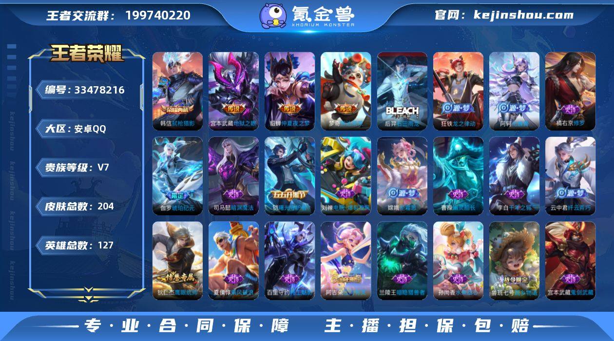 [18679582]V7 1典藏 3传说 127英雄 204皮肤 可二次 可修改实名 男号 【英雄全皮】大禹全皮 【稀有英雄】大司命,韩信(韩跳跳),夏洛特(夏师傅),艾琳,橘右京(橘子),娜可露露(鸟人),不知火舞,赵云,金蝉(唐僧),戈娅 【荣耀水晶】弑枪猎影(韩信典藏) 【传说皮】仲夏夜之梦(大飞蛾),地狱之眼,胖达荣荣 【珍宝阁皮】妄想食味,胡桃夹子 【赛季/战令皮】古海寻踪(s33),海盐诗旅(s30),擒涛扼浪(s31),探海日志(s32),流音漫舞,地狱燃心,剑破天穹(s35),天穹祈灯(s34),青焰无极,苍威无极,天穹之誓(s36),原初探秘者(s21),万华元夜(s22),千军破阵(s25),沙漠行僧(s26),金庭之子(s27),大漠名商(s28),云中旅人(s29) 【史诗皮】琥珀纪元伽罗,蔬乡物语(鲁班七号),化蝶舞,线条小狗-周瑜,万灵启世,涂山容容,龙之律动,百相守梦-黄忠,石田雨龙,紫霞仙子,特工魅影,千年之狐,江河有灵,高渐离燃音魔法,雪夜绮愿(周瑜),百解令(蒙犽),冰冠公主,电玩·爆裂旋风,末日机甲-吕布,猫狗日记-孙策,猫狗日记-大乔,乱世虎臣,节奏热浪,修罗,摇滚巨星,水果甜心,功夫厨神,德古拉伯爵,暗隐猎兽者,幽灵船长,鬼剑武藏,暗渊魔法,地狱岩魂,纤云弄巧,拒霜思,缤纷独角兽,乘风破浪,逐浪之夏,曙光守护者,热力回旋,金属风暴,圣诞狂欢...