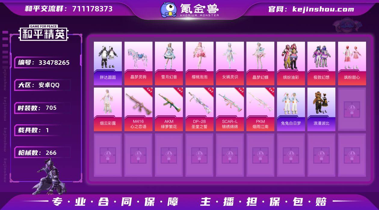 【稀有枪皮】AUG-暖羊咩咩,AMR-智耀战神,GROZA-镜光银凌,Kar98K-巳巳如意,UMP45-萌骑冒险,14-福马献瑞,DP-28-豹影疾电,M416心之恋语,AKM绿萝繁花,DP-28圣堂之誓,SCAR-L-锦绣绵绵,PKM江南烟雨