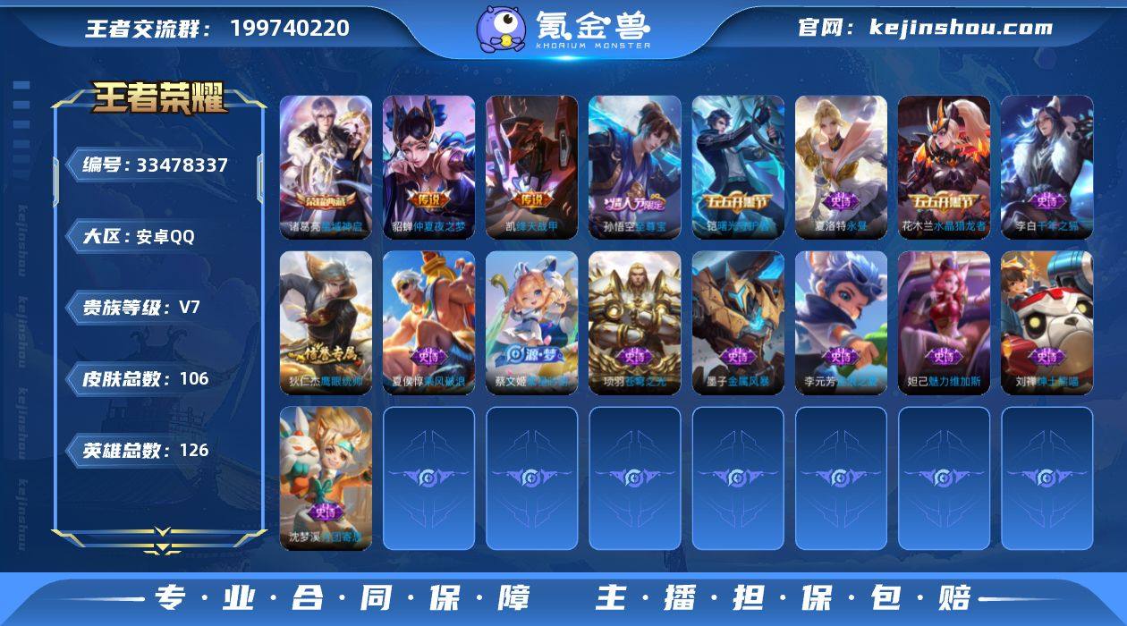 [18681976]V7 1典藏 3传说 126英雄 106皮肤 可二次 可修改实名 男号 【稀有英雄】大司命,嬴政(始皇帝),韩信(韩跳跳),夏洛特(夏师傅),艾琳,橘右京(橘子),娜可露露(鸟人),不知火舞,赵云,金蝉(唐僧),戈娅 【荣耀水晶】星域神启(倪克斯贼亮) 【传说皮】仲夏夜之梦(大飞蛾),绛天战甲(鸡嘴战神) 【赛季/战令皮】噬灭天穹(s37),古海寻踪(s33),海盐诗旅(s30),探海日志(s32),天穹祈灯(s34),妖精王(s5),炼金王(s6),凯尔特女王(s7),狰(s8),饕餮(s9),重明(s11),穷奇(s12),御狮(s13),疑决卦(s19),醍醐杖(s20),驱傩正仪(s24),千军破阵(s25),火炮绅士,沙漠行僧(s26),幻夜卜梦,金庭之子(s27),大漠名商(s28),云中旅人(s29) 【史诗皮】苍穹之光,千年之狐,永昼,绅士熊喵,繁星吟游(呼啦呼啦),乘风破浪,逐浪之夏,月团寄思,水晶猎龙者,曙光守护者,金属风暴,鹰眼统帅,魅力维加斯 【限定皮】鸣野蒿,至尊宝,高山流水,五谷丰年,梁祝,天狼溯光者 【普通皮】功夫炙烤,鬼谷子天穹祈灯(S34),五福同心,花好人间,归虚梦演-曜,海滩丽影,海滩派对,皇家上将,魔术师,沉稳之力,掌控之力,守护之力,化身博士,纽约教父,乓乓大师,黄金武士,次元突破,天使之翼,功夫老勺,鲨炮海盗猫,教廷特使,星际陆战队(程咬金),阴阳师...