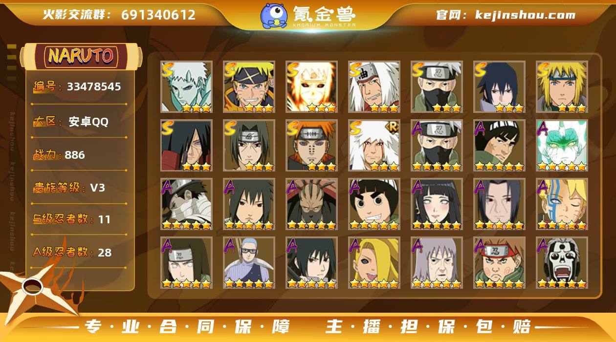 MHY4119【安卓Q 11S 28A VIP3 通灵兽17 】无二次【区服】3550【等级】143【S级数量】11【A级数量】28【B级数量】55【C级数量】52【S级】宇智波佐助「永恒万花筒」 自来也「舞之豪杰」 宇智波带土「十尾人柱力」 佩恩「天道」 旗木卡卡西「须佐能乎」 宇智波斑「秽土转生·解」 漩涡鸣人·宇智波佐助 波风水门 宇智波鼬「须佐能乎」 自来也「传说中的三忍」 波风水门「九喇嘛连结」 【A级】迪达拉「秽土转生」 飞段 秋道丁次「忍界大战」 漩涡博人「桃式显现」 小南「神驹佑将」 旗木卡卡西「神威对决」 迈特凯「青春爆炸」 干柿鬼鲛 千代「近松十人卫」 宇智波鼬 日向雏田「最终章」 土台「忍界大战」 飞段「死司凭血」 桃地再不斩「秽土转生」 李洛克「忍界大战」 蝎「绯流琥」 巳月「仙人模式」 蝎 我爱罗「疾风传」 长十郎「六代目水影」 迈特凯 神秘面具男「忍者之路」 宇智波泉奈 波风水门「青年」 日向宁次「忍界大战」 猿飞阿斯玛 旗木卡卡西「幻之真容」 宇智波佐助「须佐能乎」 【B级】佩恩「饿鬼道」 宇智波佐助「咒印」 勘九郎「疾风传」 日向雏田「疾风传」 佐井 手鞠「疾风传」 漩涡玖辛奈 天天「疾风传」 李洛克「疾风传」 佩恩「修罗道」 萨姆伊「新春限定」 君...