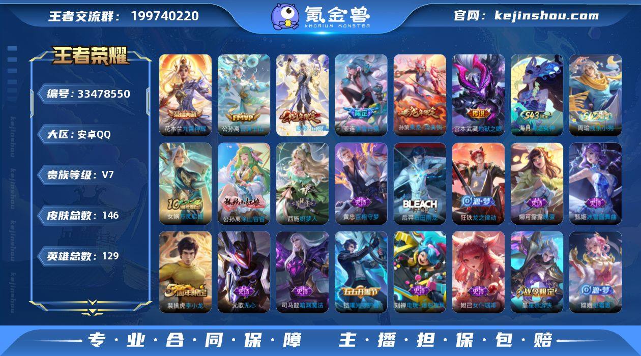 实名: 可修改 性别: 男号 贵族等级: V7 英雄数: 129 皮肤数: 146 荣耀水晶: 九霄神辉 传说皮: 地狱之眼,乘龙·淬吴钩,落雪白狼,云诺千山 限定皮: 李小龙,愿照·山河定 亮点: 【优质装备】:九霄神辉(木兰典藏),地狱之眼,涂山容容