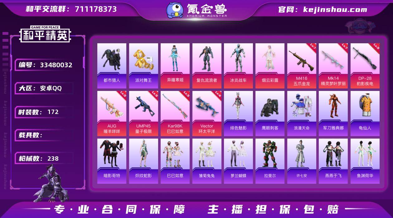 安卓 手Q-天赋8级-5粉装-11特效枪-6粉色飞行器-70353热力值-13王牌印记-172套装-238枪皮 【热门品类】:套装-浪漫天命,套装-都市猎人,套装-派对舞王,角色-军刀雅典娜,套装-龟仙人,套装-暗影哥特 【粉色套装】:角色-复仇流浪者,角色-冰炎战车,角色-烟云彩露,角色-异瞳寒姬,角色-烬夜之誓 【粉色枪皮等级】:M416-五爪金龙(七级),GROZA-旋星之夜(三级),AUG-暖羊咩咩(五级),UMP45-量子极限(五级),Vector-环太平洋(四级),AKS-74U-森灵之息(五级),Kar98K-巳巳如意(五级),Mk14-精灵梦叶罗丽(七级),Mk14-福马献瑞(五级),AA12-G-萌骑幻想(三级),DP-28-豹影疾电(五级) 【粉色枪皮】:M416-五爪金龙,GROZA-旋星之夜,AUG-暖羊咩咩,UMP45-量子极限,Vector-环太平洋,AKS-74U-森灵之息,Kar98K-巳巳如意,Mk14-精灵梦叶罗丽,Mk14-福马献瑞,AA12-G-萌骑幻想,DP-28-豹影疾电 【粉色飞行器】:炫彩糖果飞行器,繁龙极客飞行器,极意拳锋飞行器,辉光之愿飞行器,云梦轻舟飞行器,六号石头人降落伞 【粉色降落伞】:至尊龙雀降落伞,环太平洋降落伞,音爆索尼克降落伞,未来歌姬降落伞,炫光之旅降落伞,沙丘之主降落伞,精灵梦叶罗丽降落伞,忍者神龟降落伞,月下...