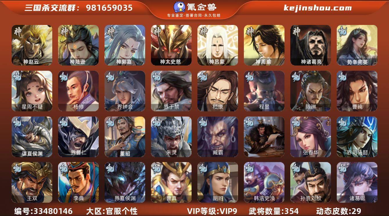 VIP等级: VIP9 官阶: 大将军 武将数量: 354 动态皮肤数量: 29 神将: 神郭嘉,神陆逊,神太史慈,神赵云,神吕蒙,神周瑜,神诸葛亮 魏国武将: 曹纯,陈琳,程昱,嵇康,界于禁,界钟会,杨修,唐咨-魏,张辽,SP蔡文姬,SP曹仁,SP关羽,SP贾诩,SP姜维,SP庞德,卞夫人,蔡贞姬,曹昂,曹操,曹冲,曹洪,曹丕,曹仁,曹叡,曹嵩,王异,鲁芝,曹休,界曹植,满宠,荀攸,王基,钟繇,蒯越蒯良,郭嘉,牵招,荀彧,阮慧,杜畿,界郭嘉,崔琰,界曹丕,界荀彧,朱灵,吕虔,界王异,界许褚,界郭淮,华歆,陈群,界邓艾,袁涣,李通,乐进,辛宪英,郭淮,毛玠,郭皇后,夏侯惇,曹植,司马朗,谋于禁,界曹操,星周不疑,许褚,界张辽,谋徐晃,张郃,钟会,文聘,曹彰,界夏侯惇,诸葛诞,司马懿,甄姬,徐晃,界曹仁,孙资刘放,韩浩史涣,胡班,曹真,典韦,界夏侯渊,夏侯渊,李典,于禁,王双,邓艾,界司马懿,张春华,孟达-魏,臧霸,朱灵(国战),董昭,谋夏侯渊,势辛宪英 蜀国武将: 董允,关索,花鬘,沙摩柯,谋马超,谋赵云,谋黄忠,马云騄,徐庶,杨仪,界关羽,界诸葛亮,界伊籍,费祎,界黄月英,界张嶷,赵云,张松,李丰,界刘备,谋法正,谋姜维,刘封,糜竺,谋庞统,黄月英,关羽,王甫赵累,吴懿,向宠,祝融,张飞,黄皓,魏延,界周仓,马忠,界法正,糜夫人,界孟获,刘禅,界赵云,张翼,关银屏,界祝融...