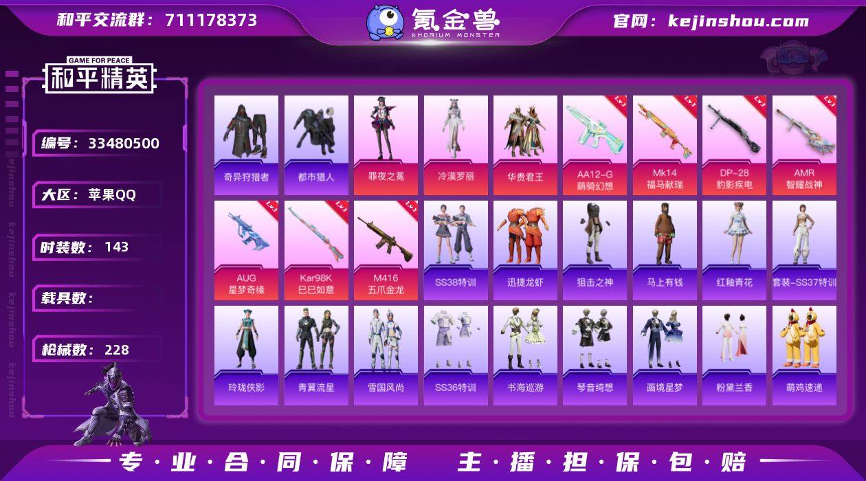 【AUG星梦奇缘都市猎人7特效枪3粉装 秒换绑不用等】 苹果Q区-63966热力值-143套装-228枪皮 【2稀有】 都市猎人 奇异狩猎者【3粉装】 罪夜之冕 华贵君王 角色-冷漠罗丽【7特效枪】 AUG-星梦奇缘(3级) M416-五爪金龙(7级) Mk14-福马献瑞(1级) AA12-G-萌骑幻想(5级) AMR-智耀战神(7级) Kar98K-巳巳如意(5级) DP-28-豹影疾电(5级)【224热门】 都市猎人(蓝口罩) 雪山精英(老6服) M416-仓鼠灰灰 M416-魔法学院 白色伏地魔 SS9特训 SS8特训 SS6特训 SS27特训 SS26特训 SS10特训 S12K-华贵君王 M762-乌木金纹 M416-乌木金纹 GROZA-乌木金纹 Mk47-乌木金纹 M416-夜灯 DBS-彩虹符号 M249-彩虹符号 MG3-幻世战舞者 AKM-星之信仰 AKM-霓虹街区 AKM-春暖花开 梦魇先生 万圣娃娃 鹰眼刺客 M416-蓝色火焰 众神之王 机械英豪 长空猛禽 甜蜜熊情侣 拳皇97八神庵 霓虹街区 魅力单车 凛冬战士 竞技勇士朋克 金环蜂王 坚韧舞者 灰色守护者 漫步者 黄色伏地魔 S686-奇异狩猎者 红色运动 黑色伏地魔 淡雅花蕊 爱崽白熊 M24-奇异狩猎者 M762-潮萌小黄鸭 S1897-糯团青竹 AA12-G-雨过天青 沙漠之鹰-雨过天青 平底锅-画境星梦 P90-紫矿核心 GROZA-紫矿核心 玲珑侠影 AWM-暮色玫影 M16A4-雨过天青 AC-VAL-...