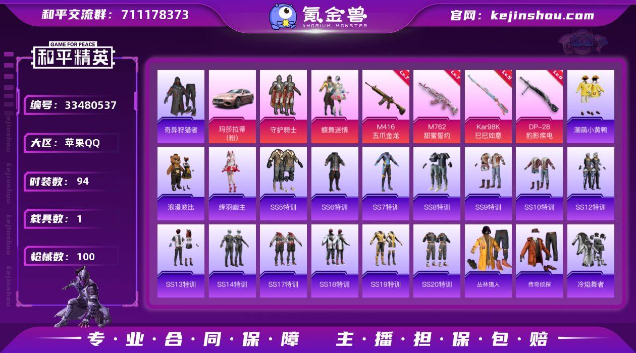 苹果 手Q-3粉装-4特效枪-1载具-2粉色飞行器-38950热力值-10王牌印记-94套装-100枪皮 QW2641411 【热门品类】:套装-奇异狩猎者,套装-潮萌小黄鸭,套装-浪漫波比 【粉色套装】:粉装-守护骑士,粉装-蝶舞迷情,角色-罪夜之冕 【粉色枪皮等级】:M416-五爪金龙(七级),M762-甜蜜誓约(七级),Kar98K-巳巳如意(五级),DP-28-豹影疾电(四级) 【粉色载具】:玛莎拉蒂Ghibli(粉) 【粉色枪皮】:M416-五爪金龙,M762-甜蜜誓约,Kar98K-巳巳如意,DP-28-豹影疾电 【粉色飞行器】:炫彩糖果飞行器,春暖花开飞行器 【粉色降落伞】:银河战甲降落伞,雪国幻梦降落伞,春暖花开降落伞,樱桃泡泡降落伞,雪月幻音降落伞,异瞳寒姬降落伞,炫彩糖果降落伞 【稀有套装】:套装-雪国风尚,套装-炫彩糖果,角色-绛羽幽主 【稀有枪皮】:AUG-冰晶雪宝,AKM-彩虹符号,AKM-春暖花开,AKM-虎虎生威,AKM-霓虹街区,SCAR-L-甜蜜誓约,M416-神秘黑猫,M416-蓝色火焰,GROZA-暗夜武装,GROZA-银河战甲,GROZA-黑色刀锋,AUG-凝视深渊,QBZ-神秘黑猫,QBZ-银河战甲,QBZ-飞驰魅影,M762-奇异狩猎者,M762-折纸暴龙,M762-拳皇97,G36C-雪国精灵,G36C-星穹咏叹调,AC-VAL-天降萌叽,UZI-古堡领主,U...