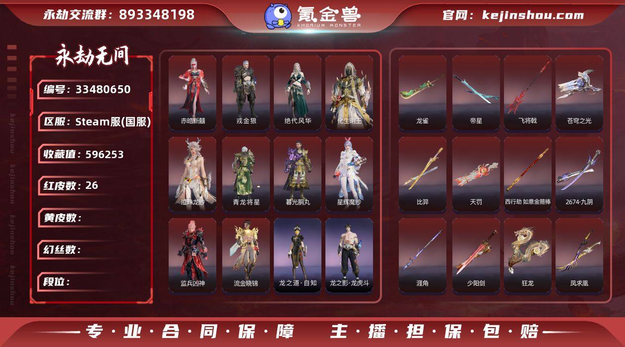 YJJ2314/steam/可换绑/等级727/s20三人白银1/29红1048金收藏值596253/赤皓新囍/墨离/星辉魔纱/化生明王/新倩女幽魂·长天藏锦/戎金狼/泣珠龙纱/青龙将星/暮光胴丸/绝代风华/监兵凶神/流金晓锦/命定之辉/天罚/苍穹之光/少阳剑/2674·终极型·紫(没原色)/2674·九阴/灵狐幻刃/比羿/帝星/龙雀/狼主/飞将戟/涯角/灵犀/西行劫·如意金箍棒/狂龙/凤求凰/2674·超越型/2674·超越型·紫/龙之道·自知/2674·初代机/龙之影·龙虎斗/龙之影·精武魂/炎烈珠/夏日派对·高校水着/春桃笑/龙之道·至纯/御宅罗梦(白丝)/彩俑娃娃/龙之道·无拘/西行劫·杨戬/龙之影·过江龙/西行劫·神君印/应龙号/夏日派对·仲夏霜华/夏日派对·盛夏白阳/夏日派对·赤夏悠漾/揽九天/幻丝140566/已绑定手游