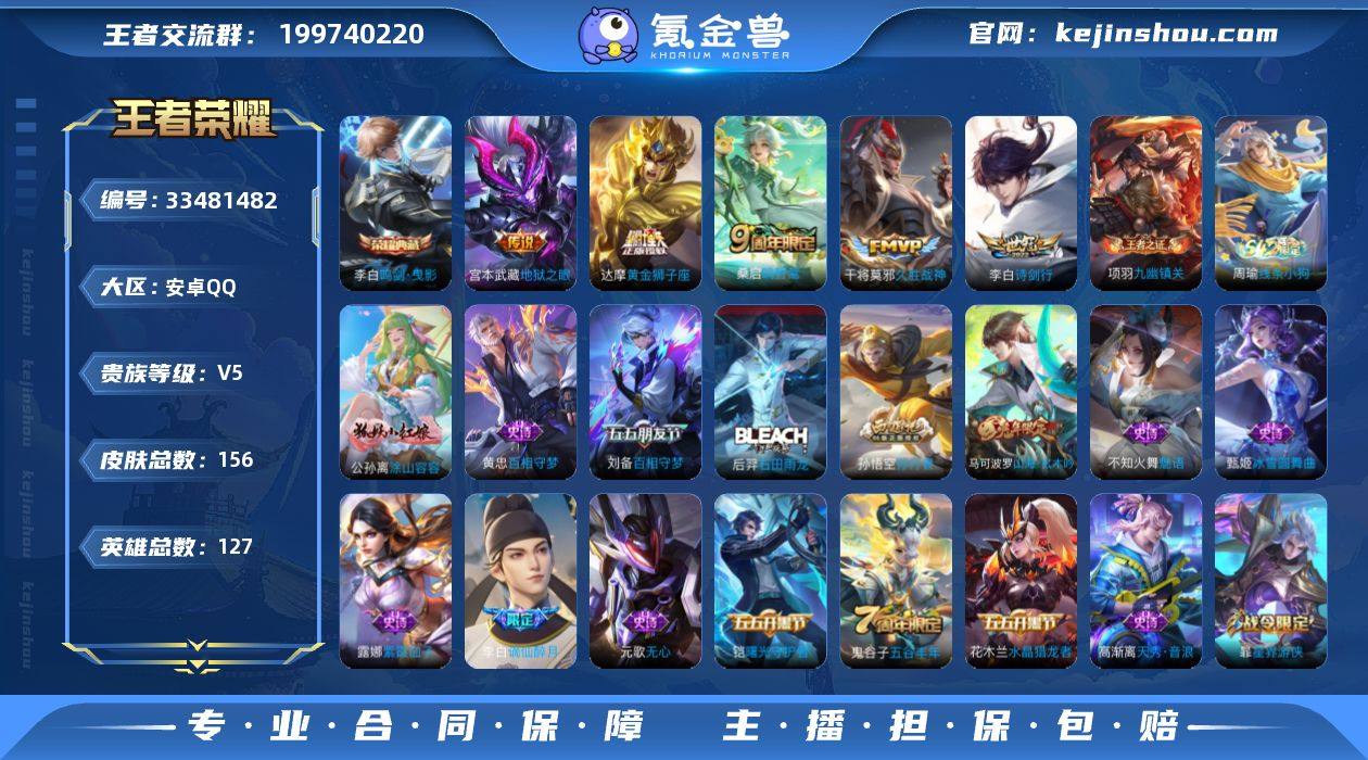 贵族等级5/荣耀典藏数量1/传说皮肤数量5/史诗皮肤数量48/皮肤数量156/英雄数量127/段位永恒钻石/鸣剑·曳影/鸣野蒿/诗剑行/久胜战神/黄金狮子座/地狱之眼/天穹之誓(s36)/谪仙醉月/阴阳师/皇家上将/优雅恋人/玩趣恶龙/重明(s11)/无心/游园惊梦/山海·玄木吟/万华元夜(s22)/海滩派对/醍醐杖(s20)/金庭之子(s27)/孙行者/百相守梦(刘备)/云中旅人(s29)/驱傩正仪(s24)/黎明之约/原初探秘者(s21)/五谷丰年/原初追遂者/顽趣-梦奇/大漠名商(s28)/擒涛扼浪(s31)/御狮(s13)/梁祝/暖冬·兔眠/探海日志(s32)/海盐诗旅(s30)/星界游侠/江河有灵/古海寻踪(s33)/蒙恬荣光圣徽/鬼谷子天穹祈灯(S34)/龙武盛年/剑破天穹(s35)/程咬金群星魔术团/熔金海岸/噬灭天穹(s37)/虚灵犬护/逆浪荇歌/荣光之誓/星界战将/九幽镇关/线条小狗-周瑜/涂山容容/百相守梦-黄忠/石田雨龙/天秀·音浪/魅语/鹰眼统帅/猫狗日记-大乔/猫狗日记-孙策/节奏热浪/星夜王子/逐浪之夏/曙光守护者/特工魅影/心灵骇客/心灵战警/暗隐猎兽者/缤纷独角兽/乘风破浪/水晶猎龙者/千年之狐/幽灵船长/圣诞狂欢/金属风暴/魅力维加斯/暗夜贵公子/水果甜心/鬼剑武藏/冰雪圆舞曲/未来纪元-赵云/紫霞仙子/班班快跑/溯影追猎/鹤鸣心笺/罗小黑战记/踏...