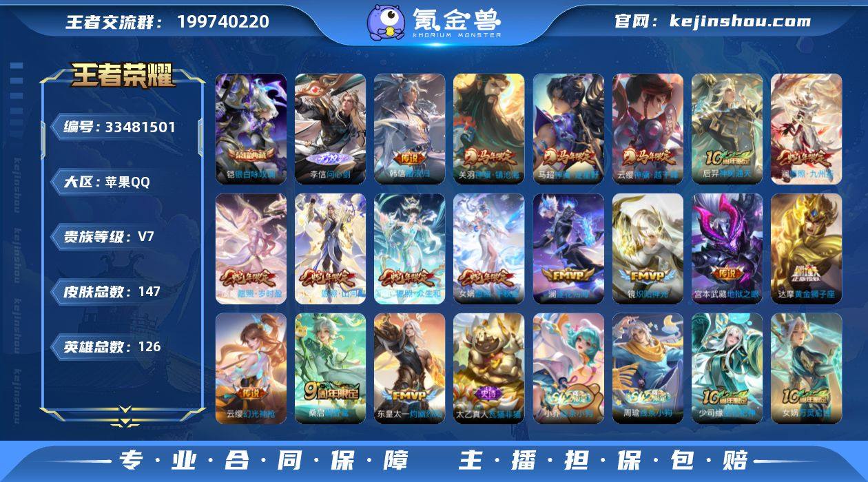 苹果Q-V7-最强王者段位-125英雄-147皮肤-1典藏皮肤-1无双-17传说-53史诗 【英雄全皮】:孙权全皮 【荣耀典藏】:铠银白咏叹调 【无双皮肤】:李信问心剑 【传说皮肤】:韩信踏浪归,云缨神骥越千峰,关羽神骥镇沧海,马超神骥逐星野,后羿神树通天,司空震愿照山河定,女娲愿照千秋盛,妲己愿照众生和,澜愿照九州拓,虞姬愿照岁时盈,云缨幻光神枪,桑启鸣野蒿,澜逐花归海,东皇太一灼幽烈阳,镜炽阳神光,达摩黄金狮子座,宫本武藏地狱之眼 【限定皮肤】:暃埋骨钱,蔡文姬夏日便利店,虞姬夏日便利店,姜子牙天穹之誓,狄仁杰阴阳师,赵云皇家上将,元歌无心,马可波罗山海玄木吟,狄仁杰魔术师,项羽海滩派对,李元芳银河之约,鬼谷子天穹祈灯,姬小满妄想食味,沈梦溪龙舞盛年,刘邦剑破天穹,海诺心动手记,周瑜熔金海岸 【年限皮肤】:马可波罗山海玄木吟,司空震愿照山河定,女娲愿照千秋盛,妲己愿照众生和,澜愿照九州拓,虞姬愿照岁时盈 【赛季限定】:鬼谷子天穹祈灯,刘邦剑破天穹,姜子牙天穹之誓,东皇太一噬灭天穹,太乙真人谧流熔炉,钟馗虚灵犬护,亚瑟荣光之誓 【战令限定】:李元芳银河之约,蔡文姬夏日便利店,虞姬夏日便利店,亚连破空之剑,孙悟空神...