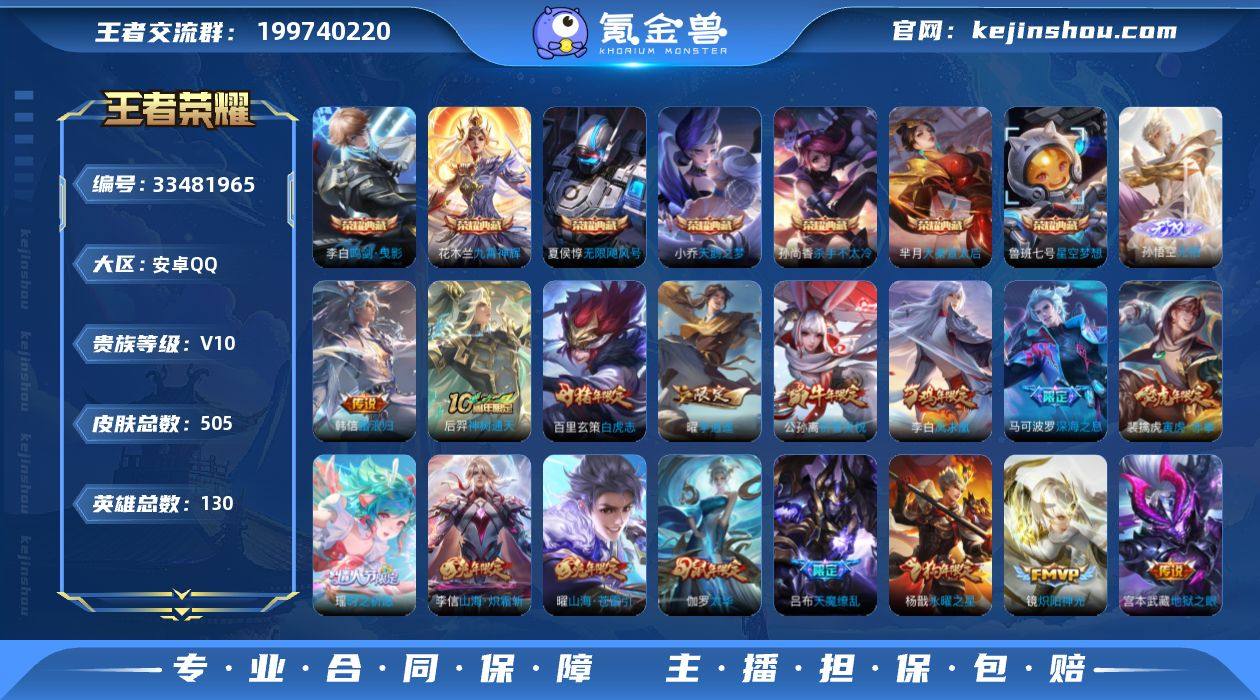 【Hwz1282】安Q-V10-130英雄-505皮肤-7典藏皮肤-1典藏英雄-1无双-64传说-174史诗-万象图鉴132等级-11975流光积分-雪境奇缘小兵-36按键-4天幕-3灵宝-5星传说-1606星元-101幸运值-25印记-2荣耀印记-89个性戳戳-2省标、2市标、20县标 【英雄全皮】:孙权全皮,娜可露露全皮,橘右京全皮,狂铁全皮,盾山全皮,猪八戒全皮,敖隐全皮,鲁班大师全皮,金蝉全皮,空空儿全皮,影全皮,少司缘全皮 【荣耀典藏】:武则天英雄,夏侯惇无限飓风号,小乔天鹅之梦,孙尚香杀手不太冷,鲁班七号星空梦想,芈月大秦宣太后,李白鸣剑曳影,花木兰九霄神辉 【无双皮肤】:孙悟空无相 【传说皮肤】:韩信踏浪归,后羿神树通天,桑启鸣野蒿,艾琳觅芳踪,孙悟空齐天大圣,小乔山海琳琅生,曜山海苍雷引,李信山海炽霜斩,吕布怒海麟威,李白诗剑行,狄仁杰神器狴犴令,不知火舞绯月行,王昭君星穹之声,橘右京枫霜尽,娜可露露前尘镜,马可波罗深海之息,后羿无尽星芒,马超无双飞将,大乔挚爱花嫁,孙策挚爱之约,女娲补天,孙策末日机甲,瑶时之祈愿,裴擒虎寅虎赤拳,鲁班七号寅虎瑞焰,孙尚香异界灵契,貂蝉遇见胡旋,赵云淬星耀世,王昭君乞巧织情,西施游龙清影,曜李逍遥 ,周瑜音你心动,...