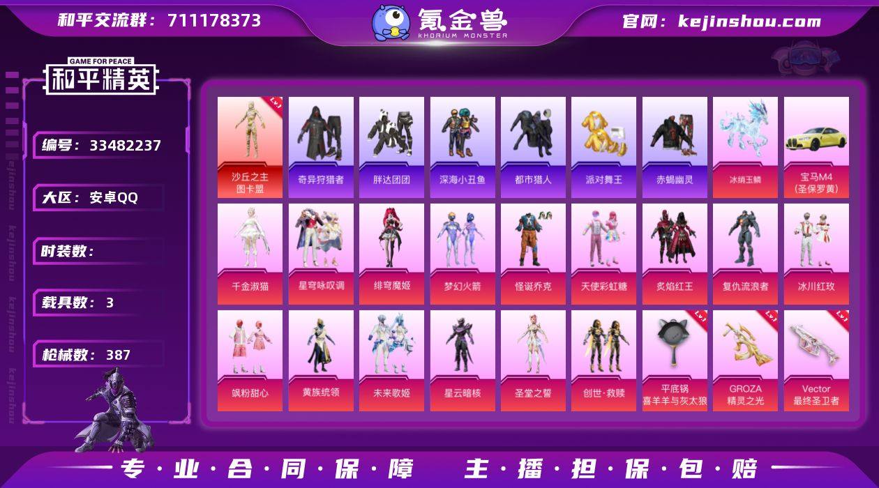 【素材号!3级图卡盟 巡查衣 赤蝎 都市 金鞋 新101 怪诞】c30231-【无二次】【因赛季更新游戏段付以上号为准!】 安卓Q-1红装7稀有4载具17粉装18特效枪33热门325套装387枪皮 23印记 历史超级王牌21星 【1红装】 沙丘之主-图卡盟 (3级) 【7稀有】 奇异狩猎者 巡查衣 赤蝎幽灵 都市猎人 浪漫天命 派对舞王 派对舞王(金靴子) 【4载具】 暮色幽蹄 宝马M4(圣保罗黄) 冰绡玉鳞 萌兔起飞僚机 【17粉装】 圣堂之誓 梦幻火箭 绯穹魔姬 天使彩虹糖 千金淑猫 异瞳寒姬 未来歌姬 星穹咏叹调 怪诞乔克 创世救赎 飒粉甜心 黄族统领 幻影战神 星云暗核 炙焰红王 冰川红玫 复仇流浪者 【18特效枪】 SCAR-L-锦绣绵绵 (5级) M416-心之恋语 (7级) P90-魔童闹海敖丙 (3级) AKS-74U-森灵之息 (1级) AKM-绿萝繁花 (5级) Kar98K-巳巳如意 (5级) Vector-绯穹魔姬 (7级) Vector-最终圣卫者 (3级) M762-青锋波束 (5级) MG-36-沧焰双生 (5级) DP-28-豹影疾电 (5级) M200-梦海之灵 (1级) UMP45-量子极限 (5级) GROZA-镜光银凌 (5级) GROZA-精灵之光 (2级) Mk14-福马献瑞 (5级) ACE32-萌骑漫游 (5级) 平底锅-喜羊羊与灰太狼 (2级) 【33热门】 Mark.06 龟仙人 雪山精英 恶魔人蛛 呆萌铁蟹 鹰眼刺客...