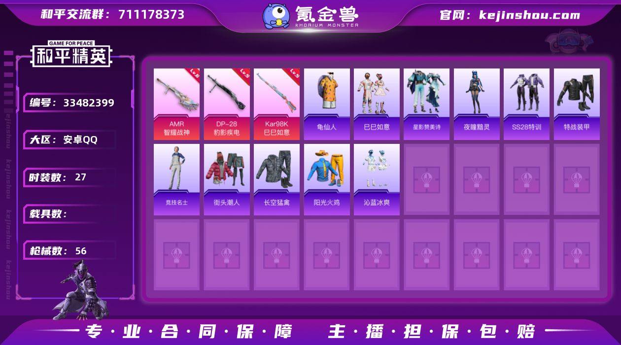 安卓【小号 套装-龟仙人/角色-虎痴许褚/UMP45-萌骑冒险(四级)/Kar98K-巳巳如意(五级)】 手Q-1粉装-5特效枪-0载具-0粉色飞行器-14863热力值-2王牌印记-27套装-56枪皮 【热门品类】:套装-龟仙人 【粉色套装】:角色-虎痴许褚 【粉色枪皮等级】:UMP45-萌骑冒险(四级),Kar98K-巳巳如意(五级),Mk14-福马献瑞(二级),AMR-智耀战神(六级),DP-28-豹影疾电(五级) 【粉色枪皮】:UMP45-萌骑冒险,Kar98K-巳巳如意,Mk14-福马献瑞,AMR-智耀战神,DP-28-豹影疾电 【粉色降落伞】:忍者神龟降落伞,星穹咏叹调降落伞,异瞳寒姬降落伞,炫彩糖果降落伞,虎痴许褚降落伞 【稀有套装】:套装-龟仙人,套装-巳巳如意,套装-马上有钱,套装-迅捷龙虾,套装-星影赞美诗,角色-夜瞳黯灵 【稀有枪皮】:M16A4-幻世战舞者,SCAR-L-夜灯,M416-红色方程式,M416-蓝色火焰,GROZA-影袭,AUG-天降萌叽,AUG-耀粉歌者,M762-天降萌叽,蜜獾-天降萌叽,UZI-天降萌叽,UZI-影袭,UZI-炫彩节奏,Vector-创世·救赎,汤姆逊-像素花束,S686-生命誓言,S12K-破晓战魂,MG3-幻世战舞者,短管霰弹-星穹咏叹调,突击盾牌-智趣喵喵 【其他套装】:套装-SS28特训,套装-特战装甲,套装-竞技名士,套装-街头潮...