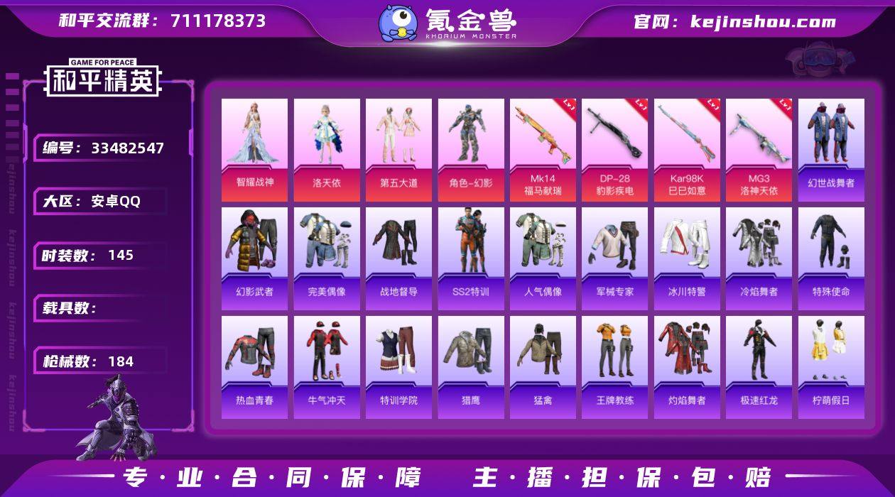 可二次【洛天依 3粉装4特效枪 可秒换绑不用等】 安卓Q区-48846热力值-145套装-184枪皮 【3粉装】 洛天依 第五大道 角色-智耀战神【4特效枪】 MG3-洛神天依(7级) Mk14-福马献瑞(4级) Kar98K-巳巳如意(5级) DP-28-豹影疾电(5级)【24热门】 M416-蓝色火焰 长空猛禽 牛气冲天 霓虹街区 破蛋小黄鸡 极速红龙 白色伏地魔 SS27特训 SS26特训 SS25特训 SS24特训 SS23特训 SS22特训 Mk47-洛神天依 SCAR-L-玉兔迎春 M762-天降萌叽 M762-彩虹符号 Mk47-乌木金纹 SKS-糯团青竹 UMP45-蓝色火焰 DBS-彩虹符号 M249-彩虹符号 AKM-霓虹街区【3飞行器】 光之冒险尾迹 空岛之星尾迹 炫彩糖果飞行器 营地ID:933727956