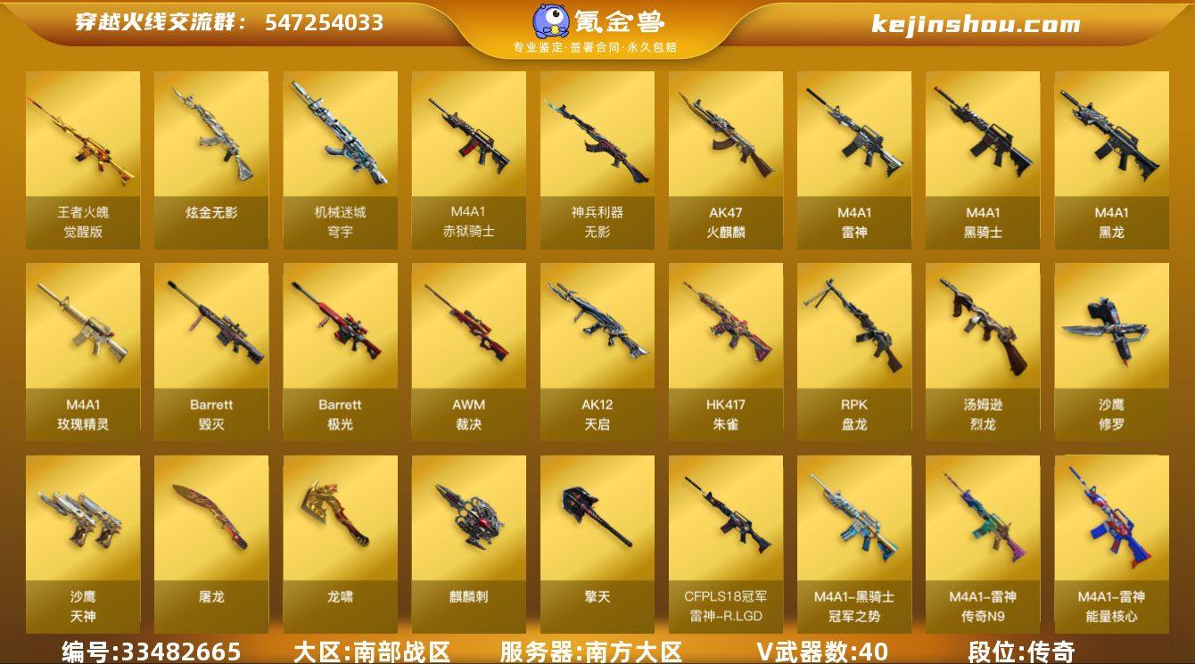 南方大区-43V-1王者武器数-1炫金武器数 【热门武器】:HK417-朱雀,M4A1-黑骑士,汤姆逊-烈龙*2,RPK-盘龙,沙鹰-修罗*2 【王者炫金武器】:炫金无影 【音效卡】:M4A1-黑骑士音效卡 【皮肤】:雷神-能量核心,雷神-荣耀之魄,雷神-传奇N9,雷神-R.LGD-CFPLS18冠军,雷神-源计划2.0专属 皮肤,火麒麟-心动糖果,毁灭耀金皮肤,黑龙-暗月,黑骑士-冠军之势,黑骑士-破界 皮肤,黑武士-典韦皮肤,极光-能量核心,修罗-能量核心,修罗-冠军之魂,麒麟刺-萌杀皮肤 【角色】:樱,战地猎狐,王者-救世主,乔伊教练,修道士,暗夜-X,电竞少女,风暴女,虎妞,嘉年华灵狐,猎狐者-追月,0号玩家,灵狐-花神,灵狐者-X,灵狐者-黄金海岸,龙儿,麻雀,曼陀罗-X,萌儿,潘多拉-X,潘多拉-甜心教官,斯沃特-X,蜀雪,铁骑荣耀,雪莉杨-摸金校尉,夜玫瑰-幻能朋克 【人偶武器】:AWM-灵狐-15周年嘉年华,迷你超能女侍 【暴走生化】:超级对讲机 【挑战大师】:AK47-冰龙粉碎者,神圣爆裂者-末日III 【英雄级武器】:AK47-火麒麟*2,M4A1-黑龙,M4A1-雷神,M4A1-黑骑士,AK12-天启,HK417-朱雀,无影-神兵利器,M4A1-玫瑰精灵,王者火魄-觉醒版,机械迷城-穹宇,Barrett-毁灭,Barrett-极...