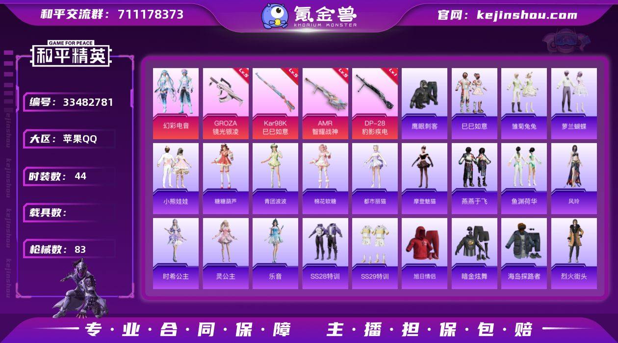 苹果【小号 GROZA-镜光银凌(五级),Kar98K-巳巳如意(五级)】 手Q-1粉装-4特效枪-0载具-1粉色飞行器-20447热力值-2王牌印记-44套装-83枪皮 【粉色套装】:粉装-幻彩电音 【粉色枪皮等级】:GROZA-镜光银凌(五级),Kar98K-巳巳如意(五级),AMR-智耀战神(五级),DP-28-豹影疾电(一级) 【粉色枪皮】:GROZA-镜光银凌,Kar98K-巳巳如意,AMR-智耀战神,DP-28-豹影疾电 【粉色飞行器】:祥瑞起舞飞行器 【粉色降落伞】:忍者神龟降落伞,千金淑猫降落伞,鬼刀降落伞,冷漠罗丽降落伞 【稀有套装】:套装-巳巳如意,套装-雏菊兔兔,套装-萝兰蝴蝶,套装-小熊娃娃,套装-糖糖葫芦,套装-青团波波,套装-棉花软糖,角色-都市丽猫,角色-摩登魅猫,套装-燕燕于飞,套装-鱼渊荷华,角色-风玲,角色-时希公主,角色-灵公主,角色-乐音 【稀有枪皮】:AKM-破晓战魂,M16A4-红色方程式,SCAR-L-夜灯,SCAR-L-红色方程式,SCAR-L-冷漠罗丽,M416-红色方程式,AUG-天降萌叽,M762-彩虹符号,UZI-红色方程式,UMP45-夜灯,UMP45-生命誓言,Vector-香水柠檬,汤姆逊-耀粉歌者,P90-巳巳如意,Kar98K-红色方程式,M24-蓝晶绮麟,SVD-冷漠罗丽,S686-生命誓言,S686-巳巳如意,S686-千金淑猫,S12K...