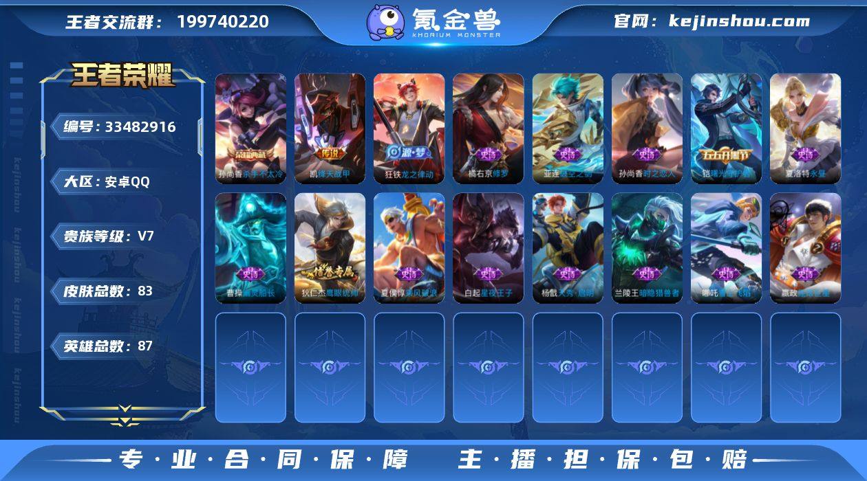 [18749072]V7 1典藏 1珍品传说 6传说 87英雄 83皮肤 可二次 可修改实名 男号 【英雄全皮】孙权全皮,蚩奼全皮,影全皮 【稀有英雄】大司命,嬴政(始皇帝),韩信(韩跳跳),夏洛特(夏师傅),艾琳,橘右京(橘子),娜可露露(鸟人),不知火舞 【荣耀水晶】杀手不太冷 【珍品传说】时之奇旅-孙策 【传说皮】异界灵契-花木兰,神骥·镇沧海,神骥·越千峰,神骥·鸣幻洲,绛天战甲(鸡嘴战神),末日机甲-孙策 【赛季/战令皮】剑破天穹(s35),天穹祈灯(s34),千军破阵(s25) 【史诗皮】海之女神,破空之剑,光弋星穹,春霖将至,撼世英歌,线条小狗-周瑜,线条小狗-小乔,万灵启世,龙之律动,紫霞仙子,永昼,时之恋人-孙尚香,修罗,摇滚巨星,星夜王子,暗隐猎兽者,幽灵船长,天秀·启明,乘风破浪,曙光守护者,鹰眼统帅,雪上飞焰,无心 【限定皮】陌上桑 【普通皮】舞狮寰,魅影绮裳,经纬探寻者,暗都幽影,往忆晖光,径山谋武,鹤鸣心笺,逐霄之志,极光幻客,溯影追猎,百相守梦-影,荣光之誓,太极少年,零食大作战,鬼谷子天穹祈灯(S34),时空谍影,龙腾万里,海滩派对,皇家上将,魔术师,缤纷绘卷,万象初新,次元突破,红桃皇后,阴阳师,汉昭烈帝,兔女郎,丁香结,白色死神,野性能量,未来纪元-宫本武藏,修竹墨客,灼热之刃,幸存者,第七人偶,埃...