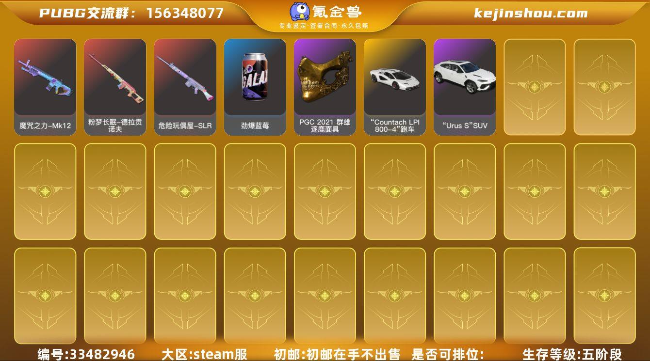账号来源: 自营 初邮情况: 初邮在手不出售 热门装扮: 金面具,黑鬼,渔夫帽 热门载具: 迈凯伦精英版 拥有成长型武器: 齿轮头-BERYL M762