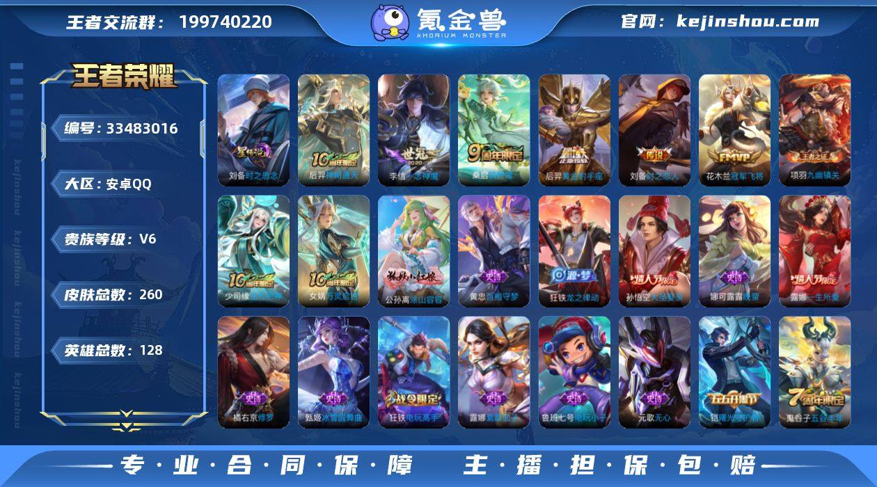 V6 6传说 1星元 260皮肤 128英雄 【6传说】后羿-黄金射手座,花木兰-冠军飞将,李信-一念神魔,刘备-时之恋人,桑启-鸣野蒿,后羿-神树通天【1星元】刘备-时之思念【67史诗】元歌-无心,鬼谷子-五谷丰年,赵云-未来纪元,狂铁-电玩高手,明世隐-吟游魔法,阿轲-节奏热浪,白起-星夜王子,百里守约-特工魅影,百里玄策-原初追逐者,蔡文姬-舞动绿茵,曹操-幽灵船长,嫦娥-拒霜思,程咬金-功夫厨神,妲己-女仆咖啡,妲己-魅力维加斯,大乔-猫狗日记,狄仁杰-魔术师,狄仁杰-鹰眼统帅,伽罗-箭羽风息,干将莫邪-真爱魔法,宫本武藏-鬼剑武藏,韩信-白龙吟,花木兰-水晶猎龙者,橘右京-修罗,黄忠-火炮绅士,铠-曙光守护者,兰陵王-暗隐猎兽者,李白-千年之狐,李元芳-逐浪之夏,廉颇-地狱岩魂,刘邦-德古拉伯爵,刘禅-绅士熊喵,刘禅-天才门将,露娜-紫霞仙子,露娜-一生所爱,鲁班七号-电玩小子,吕布-圣诞狂欢,吕布-末日机甲,墨子-金属风暴,娜可露露-晚萤,孙策-猫狗日记,孙尚香-水果甜心,孙悟空-大圣娶亲,王昭君-偶像歌手,夏侯惇-乘风破浪,项羽-苍穹之光,小乔-缤纷独角兽,雅典娜-黎明之约,亚瑟-心灵战警,杨玉环-遇见飞天,杨戬-天秀·启明,嬴政-摇滚巨星,嬴政-暗夜贵公子,嬴政-优雅恋人,张飞-乱世虎臣,赵云-皇家上将,甄姬-...