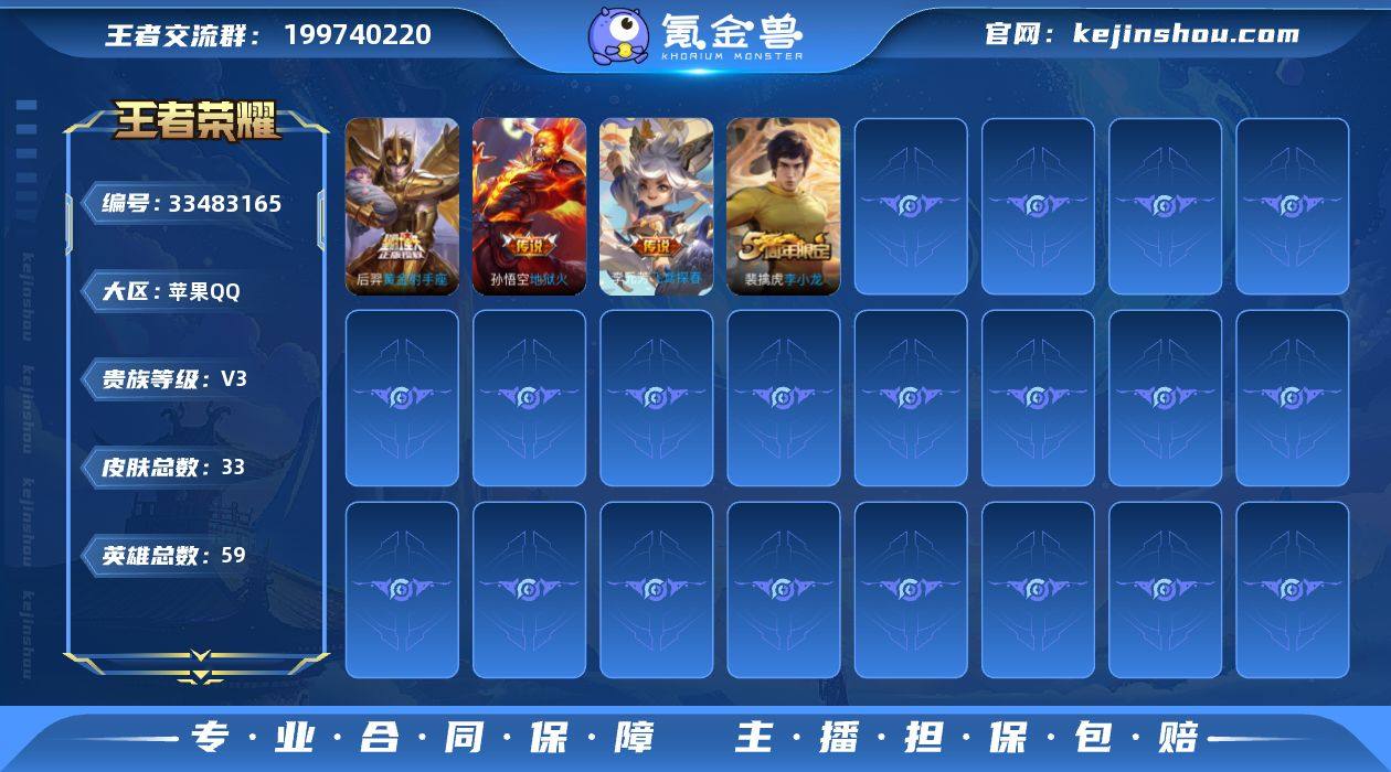 苹果Q 不可二次 4传说59英雄33皮肤 神骥赴朔漠 地狱火 黄金射手座 飞鸢探春 李小龙 金属风暴 心灵战警 千年之狐 幽灵船长 节奏热浪 街头霸王 敏锐之力 魅力维加斯 水果甜心 鹰眼统帅 王者荣耀账号
