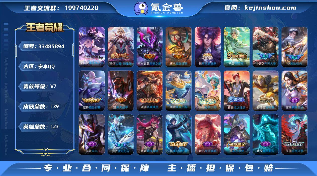 【XY1381】贵族等级7/传说皮肤数量10/史诗皮肤数量35/皮肤数量139/英雄数量123/段位最强王者/敖隐全皮/酷洛米之心/关羽神骥镇沧海/鸣野蒿/铠冥王哈迪斯/典韦战鼓燎原/琥珀纪元铠/齐天大圣/山海·炽霜斩/绛天战甲/猫影幻舞/地狱之眼/天穹之誓(s36)/阴阳师/皇家上将/蔷薇恋人/奇幻香踪/无心/魔术师/海滩派对/百相守梦(关羽)/美猴王/孙行者/潮玩骑兵/擒涛扼浪(s31)/纤云弄巧/暖冬·兔眠/玲珑珍味/探海日志(s32)/海盐诗旅(s30)/星界游侠/古海寻踪(s33)/鬼谷子天穹祈灯(S34)/琥珀纪元伽罗/蔬乡物语(鲁班七号)/蔬乡物语(李元芳)/剑破天穹(s35)/噬灭天穹(s37)/荣光之誓/九幽镇关/神迹守卫/线条小狗-周瑜/线条小狗-小乔/海月海之女神/龙之律动/真我赫兹(百里守约)/唤灵魅影/鹰眼统帅/猫狗日记-大乔/星夜王子/曙光守护者/特工魅影/缤纷独角兽/乘风破浪/白龙吟/千年之狐/幽灵船长/女仆咖啡/魅力维加斯/摇滚巨星/暗夜贵公子/水果甜心/鬼剑武藏/偶像歌手/暗夜猫娘/紫霞仙子/影百相守梦/吕布舞狮寰/班班快跑/线条小狗-妲己/苍云破阵/糖果风暴/溯影追猎/布丁狗之约/朵莉亚金色潮汐/完美运算/妄想特派/零食大作战/太极少年/乐园追猎者/牛运亨通/潮玩探月行/潮玩造梦师/乓乓大师/特工战影/次元突...