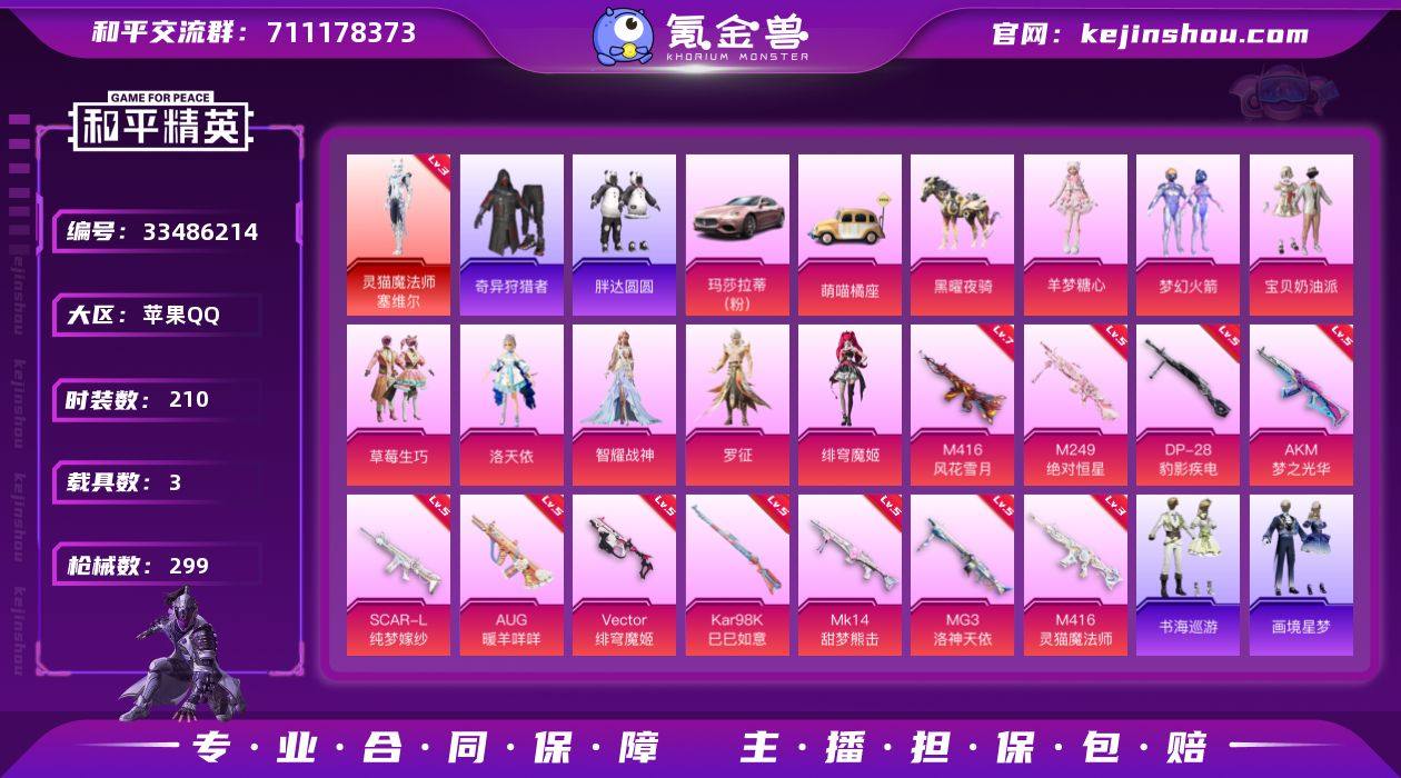 【奇异狩猎者、胖达圆圆、便宜捡漏号】苹果 手Q-1神装-8粉装-14特效枪-3载具-5粉色飞行器-99372热力值-22王牌印记-210套装-299枪皮【红色神装等级】:灵猫魔法师-塞维尔(三级)【红色角色神装】:灵猫魔法师-塞维【热门品类】:粉装-梦幻火箭,套装-浪漫天命,套装-奇异狩猎者,套装-胖达圆圆,套装-金羽特工,套装-龟仙人【粉色套装】:粉装-宝贝奶油派,粉装-梦幻火箭,粉装-草莓生巧,角色-洛天依,角色-智耀战神,角色-罗征,角色-绯穹魔姬,角色-羊梦糖心【粉色枪皮等级】:AKM-梦之光华(五级),SCAR-L-纯梦嫁纱(五级),M416-风花雪月(七级),M416-灵猫魔法师(三级),AUG-暖羊咩咩(五级),UMP45-萌骑冒险(二级),Vector-绯穹魔姬(五级),AKS-74U-森灵之息(五级),Kar98K-巳巳如意(五级),Mk14-甜梦熊击(五级),Mk14-福马献瑞(五级),M249-绝对恒星(五级),DP-28-豹影疾电(五级),MG3-洛神天依(五级)粉色载具】:玛莎拉蒂Ghibli(粉),萌喵橘座,黑曜夜骑【粉色枪皮】:AKM-梦之光华,SCAR-L-纯梦嫁纱,M416-风花雪月,M416-灵猫魔法师,AUG-暖羊咩咩,UMP45-萌骑冒险,Vector-绯穹魔姬,AKS-74U-森灵之息,Kar98K-巳巳如意,Mk14-甜梦熊击,Mk14-福马献瑞,M249-绝对恒星...
