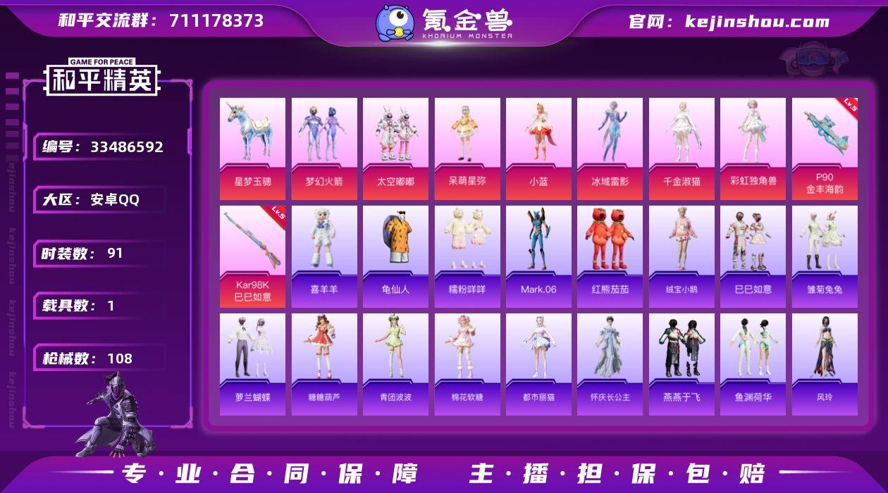 安卓【小号 粉装-梦幻火箭,套装-糯粉咩咩,角色-Mark.06,套装-红熊茄茄,P90-金丰海韵(五级),Kar98K-巳巳如意(五级),星梦玉骢】 手Q-8粉装-2特效枪-1载具-4粉色飞行器-36310热力值-6王牌印记-91套装-108枪皮 【热门品类】:粉装-梦幻火箭,套装-龟仙人,套装-糯粉咩咩,角色-Mark.06,套装-红熊茄茄 【粉色套装】:粉装-梦幻火箭,粉装-太空嘟嘟,角色-呆萌星弥,角色-小蓝,角色-冰域雷影,角色-千金淑猫,角色-彩虹独角兽 【粉色枪皮等级】:P90-金丰海韵(五级),Kar98K-巳巳如意(五级) 【粉色载具】:星梦玉骢 【粉色枪皮】:P90-金丰海韵,Kar98K-巳巳如意 【粉色飞行器】:天之羽翼飞行器,沙丘之主天马,冠军兔兔飞行器,幻海精灵飞行器 【粉色降落伞】:梦幻火箭降落伞,蜜语绒猫降落伞,巴啦啦小魔仙降落伞,精灵梦叶罗丽降落伞,冠军兔兔降落伞,鸢尾晶梦降落伞,创世·救赎降落伞,雪月幻音降落伞 【稀有套装】:套装-龟仙人,套装-绒宝小鹅,套装-巳巳如意,套装-雏菊兔兔,套装-萝兰蝴蝶,套装-糖糖葫芦,套装-青团波波,套装-棉花软糖,角色-都市丽猫,角色-怀庆长公主,套装-燕燕于飞,套装-鱼渊荷华,角色-风玲,玩偶服-喜羊羊 【稀有枪皮】:AKM-江南烟雨...