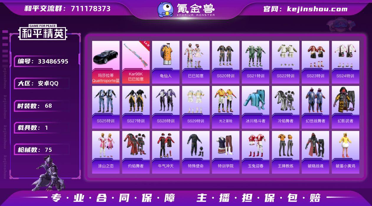 安卓【小号 套装-龟仙人/Kar98K-巳巳如意(五级)/玛莎拉蒂Quattroporte(夜幕蓝)】 手Q-0粉装-1特效枪-1载具-0粉色飞行器-23976热力值-6王牌印记-68套装-75枪皮 【热门品类】:套装-龟仙人 【粉色枪皮等级】:Kar98K-巳巳如意(五级) 【粉色载具】:玛莎拉蒂Quattroporte(夜幕蓝) 【粉色枪皮】:Kar98K-巳巳如意 【粉色降落伞】:幻影战神降落伞,音爆索尼克降落伞,虹云熊熊降落伞 【稀有套装】:套装-龟仙人,套装-巳巳如意 【稀有枪皮】:AKM-龙的传人,M16A4-幻世战舞者,M16A4-甜心亚梦,M16A4-红色方程式,M16A4-蓝色火焰,SCAR-L-炫彩节奏,SCAR-L-玉兔迎春,SCAR-L-红色方程式,M416-糯团青竹,M416-红色方程式,M416-蓝色火焰,GROZA-田园牧歌,QBZ-彩虹符号,M762-天降萌叽,AC-VAL-天降萌叽,AC-VAL-甜心亚梦,蜜獾-娇憨猪猪,UZI-天降萌叽,UZI-娇憨猪猪,UMP45-涂山之恋,UMP45-生命誓言,UMP45-蓝色火焰,Vector-生命誓言,Vector-田园牧歌,汤姆逊-天降萌叽,Kar98K-王子的夏天,Kar98K-红色方程式,AWM-不夜海上花,SKS-炫彩节奏,VSS-田园牧歌,Mini14-涂山之恋,SLR-娇憨猪猪,S686-生命誓言,S1897-炫彩节奏,S12K-玩趣呆呆,S12K-娇憨猪猪,S12K-幻世战...