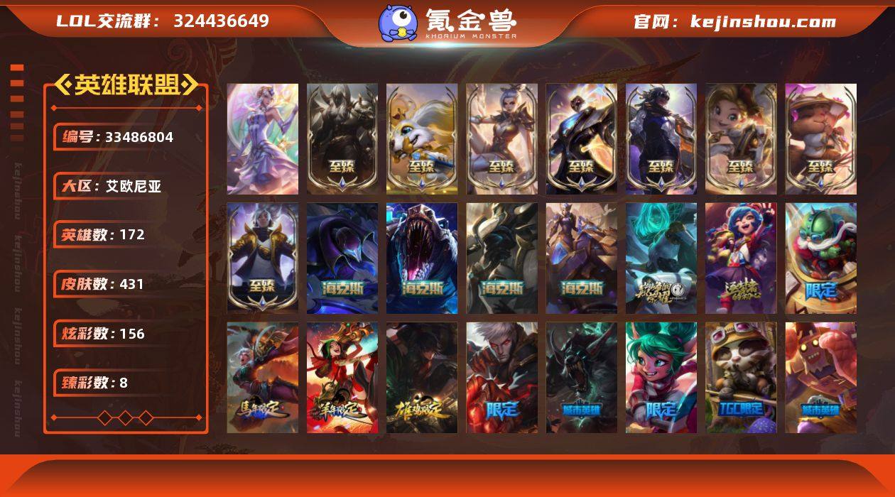【LOLYT144】172英雄/431皮肤/1终极/15神话/65限定/8臻彩/156炫彩/33传说/113史诗/未定级/至爱的鹿/玉剑传说舞剑仙/10周年 安妮/源代码 乐芙兰/10周年庆典 凤凰/至臻 灵魂莲华 提莫/至臻 玉剑传说 武剑仙/至臻 绒毛菲兹/至臻 奥术师 佐伊/至臻 真实伤害 亚索/至臻 真实伤害 赛娜/至臻 腥红之月 亚托克斯/至臻 未来战士 锤石/海克斯 魔腾/海克斯 雷克顿/海克斯 瑟庄妮/海克斯 人马/天龙之子 卡莎 飞龙乘云/墨之影武者 亚索 金墨耀影/玉剑传说 舞剑仙 轩辕/冠军典狱长 锤石 凯旋圣装/神龙尊者 圣龙李青 龙腾云起/泳池派对 奥莉安娜 优雅珠光鲸/魔女 阿卡丽 虚荣/净雪之月 莫甘娜 冬虹/替父从军 花木兰/神龙烈焰 金克丝/虎痴之拳 蔚/英勇玩具兵船长/冰雪节 茂凯/圣诞玩偶 波比/圣诞驯鹿 克格莫/冰雪节 炼金/冰雪女神 辛德拉/大元素使/卧虎藏龙 贾克斯/冠军典狱长 锤石/冠军之矛 卡莉丝塔/冠军之箭 艾希/S1FNC 迦娜/S1FNC 库奇/S2 暗杀星 努努/S2 暗杀星 慎/S2 暗杀星 伊泽瑞尔/S3 SKT T1 李青/S4 SSW 泰隆/S5 SKT T1 阿兹尔/S5 SKT T1 瑞兹/S5 SKT T1 蜘蛛/S7 SSG 伊泽瑞尔/S7 SSG 纳尔/S8 IG 菲奥娜/S8 IG 艾瑞莉娅/S8 IG 卡密尔/S8 IG 卡莎/S8 IG 乐芙兰/S8 IG 洛/S9 FPX 李青/...