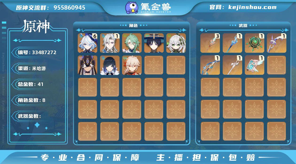 41黄 风元素:0命枫原万叶, 0命流浪者, 0命魈 火元素:0命宵宫 水元素:1命那维莱特, 6命芙宁娜, 0命夜兰, 0命达达利亚 雷元素:0命赛诺, 0命八重神子 岩元素:0命钟离 草元素:0命白术, 0命纳西妲 【常驻五星角色及命座】 风元素:0命琴 火元素:1命迪卢克 水元素:0命莫娜 雷元素:0命刻晴 冰元素:2命七七 草元素:0命提纳里 单手剑:精1静水流涌之辉, 精1风鹰剑, 精1风鹰剑 长柄武器:精3天空之脊, 精1赤沙之杖 法器:精1天空之卷, 精1碧落之珑, 精1神乐之真意 弓:精1终末嗟叹之诗, 精1阿莫斯之弓 【角色皮肤】 四星角色:行秋-雨化竹身, 凯亚-帆影游风, 丽莎-叶隐芳名, 菲谢尔-极夜真梦, 香菱-岁夜欢哗