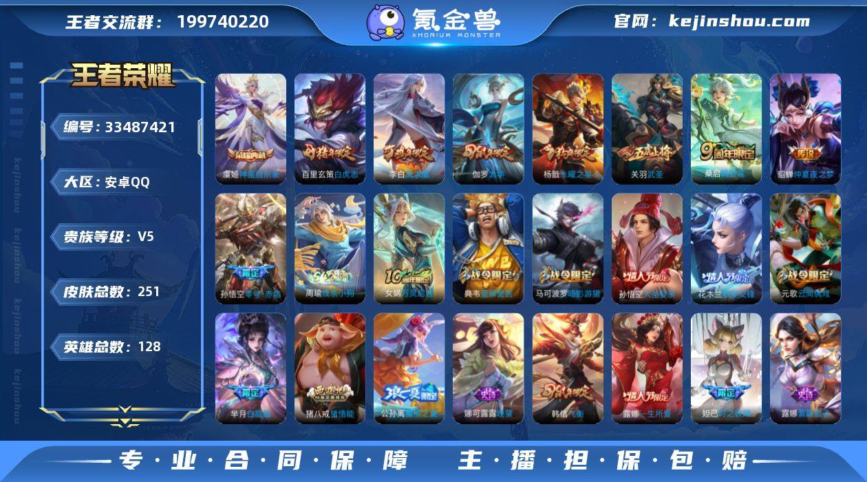 安卓Q-V5-永恒钻石III段位-128英雄-251皮肤-1典藏皮肤-8传说-66史诗 【英雄全皮】:猪八戒全皮,影全皮 【荣耀典藏】:虞姬神鉴启示录 【传说皮肤】:桑启鸣野蒿,孙悟空零号赤焰,关羽武圣,伽罗太华,百里玄策白虎志,杨戬永曜之星,貂蝉仲夏夜之梦,李白凤求凰 【限定皮肤】:白起狰,狄仁杰阴阳师,虞姬凯尔特女王,赵云皇家上将,妲己时之彼端,嬴政白昼王子,鲁班七号狮舞东方,高渐离死亡摇滚,阿轲迷踪丽影,钟无艳王者之锤,扁鹊炼金王,芈月重明,芈月白晶晶,吕布猎兽之王,周瑜赤莲之焰,元歌云间偶戏,夏侯惇朔风刀,曹操烛龙,典韦穷奇,典韦蓝屏警告,马可波罗暗影游猎,狄仁杰魔术师,狄仁杰万华元夜,达摩星际陆战队,达摩沙漠行僧,项羽海滩派对,老夫子醍醐杖,关羽武圣,程咬金演武夺筹,露娜一生所爱,刘邦夺宝奇兵,韩信逐梦之影,韩信飞衡,兰陵王驯魔猎人,兰陵王金庭之子,花木兰默契交锋,亚瑟潮玩骑士王,孙悟空大圣娶亲,孙悟空零号赤焰,牛魔御旌,后羿圣弓游侠,李元芳银河之约,李元芳云中旅人,钟馗神迹守卫,钟馗驱傩正仪,杨玉环遇见飞天,杨戬永曜之星,女娲朔望之晖,干将莫邪真爱魔法,雅典娜单词大作战,雅典娜黎明之约,蔡文姬繁星吟...