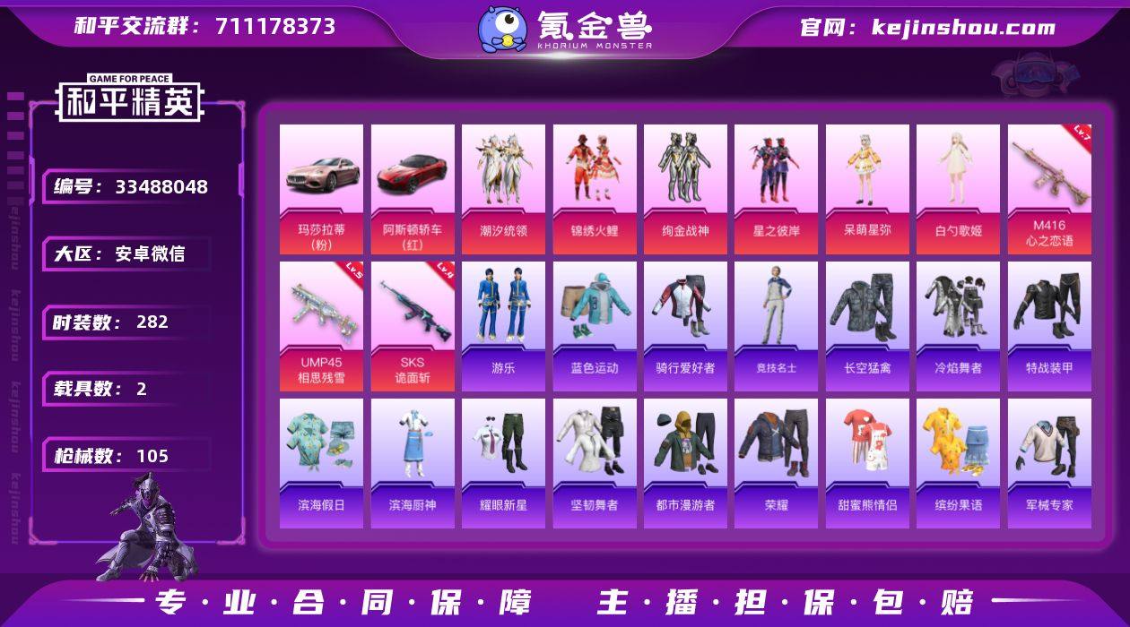 实名: 可修改 时装数: 282 载具数: 2 枪械数: 105 战备数: 2 热门装扮: 锦绣火鲤,绚金战神,潮汐统领,星之彼岸,白勺歌姬,呆萌星弥 载具: 玛莎拉蒂Ghibli(粉),阿斯顿·马丁DBS(红) 稀有枪皮: M416心之恋语,SKS诡面斩,UMP45相思残雪 亮点: 【优质装备】:七级M416-心之恋语