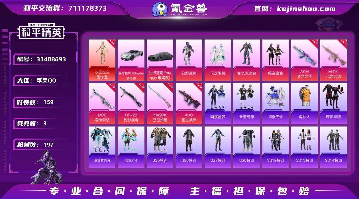 苹果 手Q-1神装-4粉装-9特效枪-3载具-6粉色飞行器-69895热力值-9王牌印记-159套装-197枪皮 【红色神装等级】:沙丘之主-图卡盟(二级) 【红色角色神装】:沙丘之主-图卡盟 【热门品类】:套装-浪漫天命,套装-龟仙人,套装-暗影哥特 【粉色套装】:粉装-幻影战神,粉装-天之羽翼,角色-复仇流浪者,粉装-暗夜鎏金 【粉色枪皮等级】:AKM-梦之光华(七级),M416-心之恋语(七级),AUG-星之彼岸(四级),ACE32-萌骑漫游(二级),AKS-74U-森灵之息(五级),Kar98K-巳巳如意(五级),Mk14-福马献瑞(五级),DP-28-豹影疾电(五级),MG3-洛神天依(七级) 【粉色载具】:兰博基尼Estoque(银翼灰),保时捷918 Spyder(液态银),暮色幽蹄 【粉色枪皮】:AKM-梦之光华,M416-心之恋语,AUG-星之彼岸,ACE32-萌骑漫游,AKS-74U-森灵之息,Kar98K-巳巳如意,Mk14-福马献瑞,DP-28-豹影疾电,MG3-洛神天依 【粉色飞行器】:香车宝马飞行器,炫彩糖果飞行器,天之羽翼飞行器,极意拳锋飞行器,暮色之舞飞行器 【粉色降落伞】:四圣焕新降落伞,洛神天依降落伞,天之羽翼降落伞,环太平洋降落伞,暗夜鎏金降落伞,未来歌姬降落伞,电糖天使降落伞,炫彩糖果降落伞,暮色玫影降落伞,虎痴许褚降落伞...