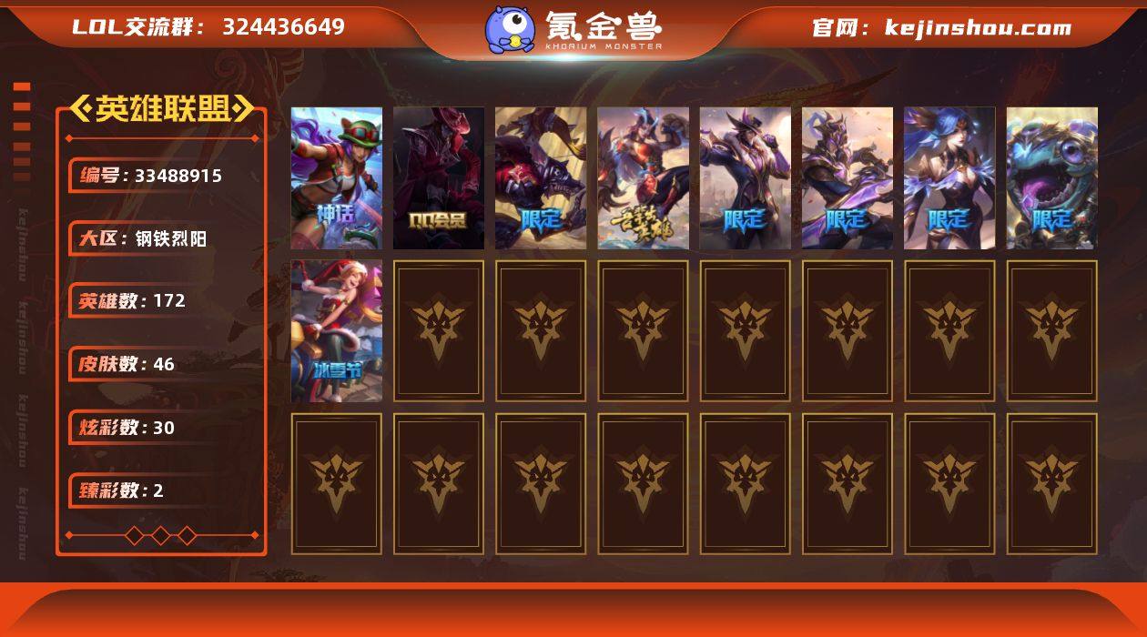 未定级段位-172英雄-46皮肤-30炫彩-0终极-1神话-11限定-3传说-11史诗 【神话皮肤】:十五周年纪念希维尔 【臻彩皮肤】:幽梦玫瑰泰隆浪漫花蕾 【冰雪限定】:冬境仙灵索拉卡,胡桃夹子萨科,圣诞捣蛋鬼金克丝 【限定皮肤】:胜利巨口克格莫,胜利女神娑娜,胜利剑圣易,胜利之运崔斯特,胜利女神菲奥娜,都铎王朝图奇,玉剑传说舞龙卫,红桃杰克崔斯特 【传说皮肤】:恶魔之刃泰达米尔,女警狙击凯特琳,第三类接触黑默丁格 【史诗皮肤】:战争机器赛恩,法国皇室厄运小姐,抵抗军天使凯特琳,无畏号墨菲特,海贼魅影卡特琳娜,三昧真火孙悟空,腥红之月凯南,ODST地狱伞兵拉克丝,亚特兰蒂斯辛德拉,猛虎布隆,虚空使者俄洛伊 【其他皮肤】:学生会长弗拉基米尔,星之吞噬者莫甘娜,灵魂莲华伊芙琳,海牛骑手库奇,三叶草墨菲特,黑色玫瑰假面舞会伊莉丝,巅峰之星李青,狂热球迷古拉加斯,战斗学院蕾欧娜,荣誉使者玛尔扎哈,索诺拉沙虫克格莫,主治医师慎,荣誉使者慎,杀出重围格雷福斯,绒毛菲兹,胜利女神菲奥娜,荣誉使者阿克尚,源计划魅灵赛娜,神龙尊者比翼之龙洛,比翼之心霞,灵能特工派克