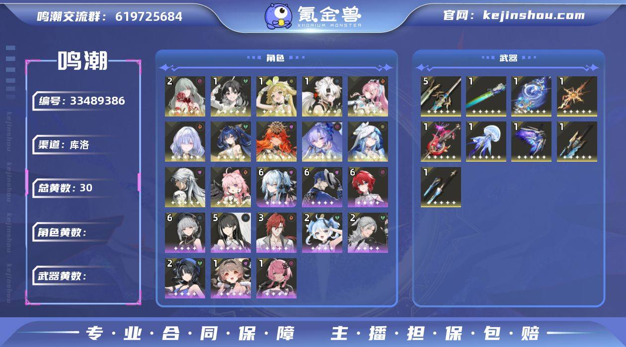 30黄,弗坎卜,日月守,爱弥斯,莫宁,差一个千咲,弗坎守日月全专武,体力结晶45,浮金9个,唤声19个,铸涛7个,4800星声。弗洛洛二链,弗坎守大世界无敌。真正的欧皇号,开号以来只歪了两次,几乎不吃保底,要啥来啥。