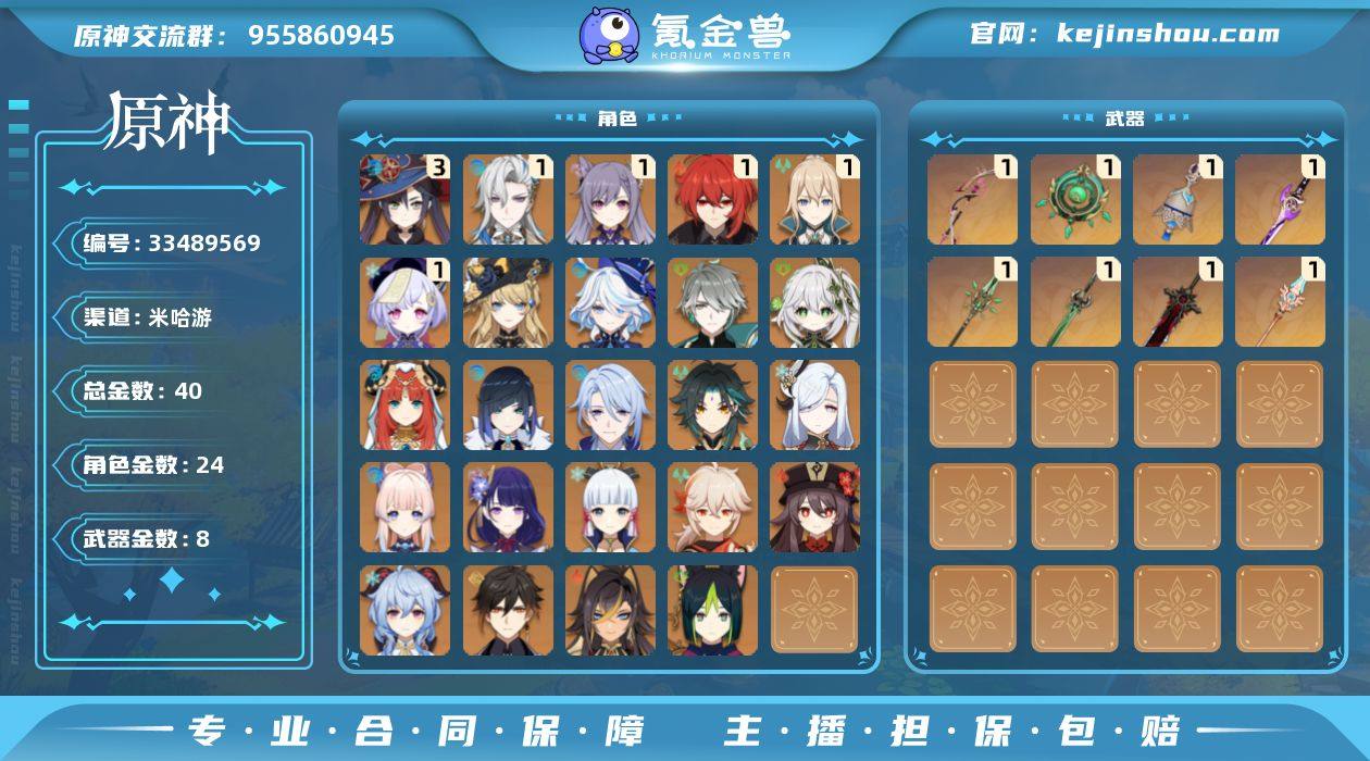 59级/40黄/女主/24个五星角色/8个五星武器 0命娜维娅,0命芙宁娜,1命那维莱特,0命迪希雅,0命艾尔海森,0命纳西妲,0命妮露,0命提纳里,0命夜兰,0命神里绫人,0命申鹤,0命雷电将军,0命枫原万叶,0命神里绫华,0命钟离,0命胡桃,0命甘雨,0命魈,0命珊瑚宫心海,1命刻晴,1命七七,1命琴,3命莫娜,1命迪卢克,精1最初的大魔术,精1碧落之珑,精1图莱杜拉的回忆,精1雾切之回光,精1磐岩结绿,精1和璞鸢,精1天空之脊,精1狼的末路