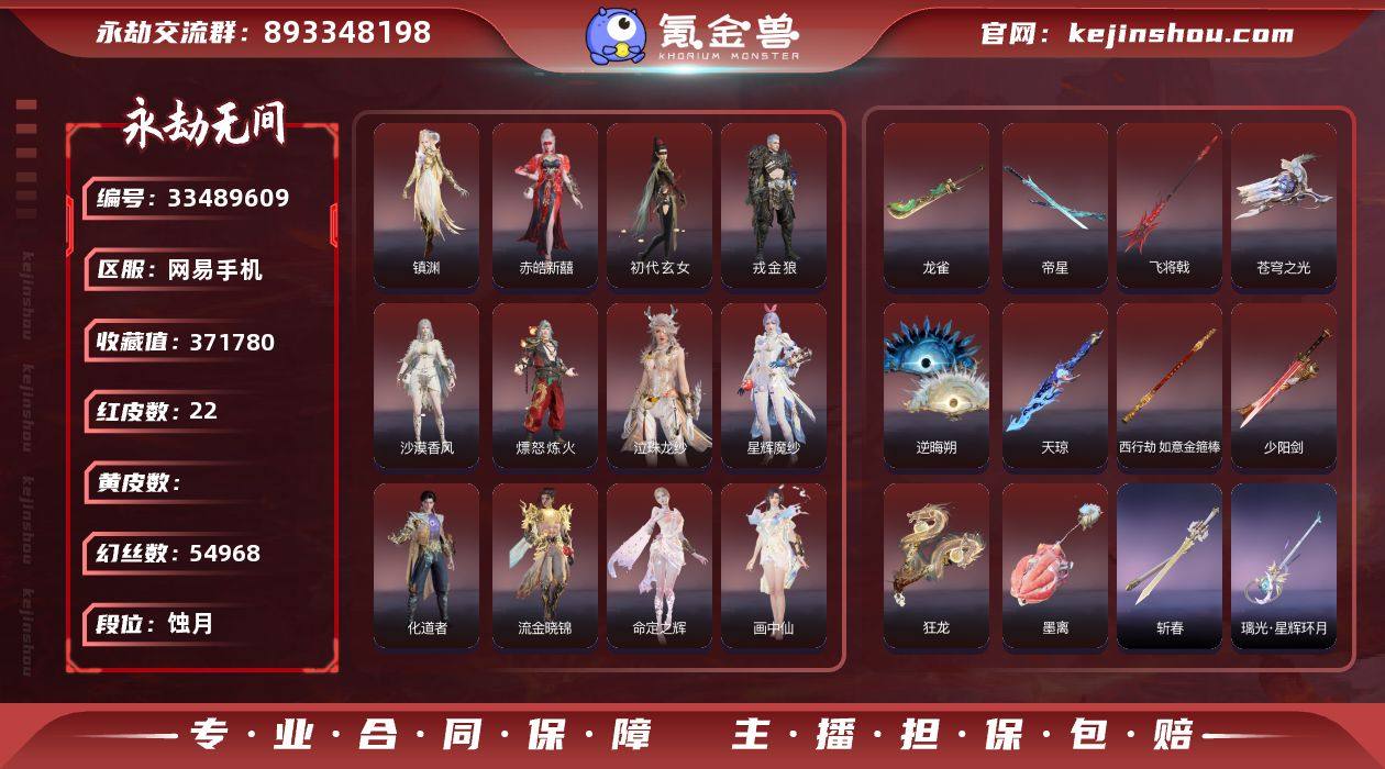 【红皮】:墨离(飞索皮肤),初代玄女(宁红叶皮肤),戎金狼(特木尔皮肤),沙漠香风(迦南皮肤),熛怒炼火(季沧海皮肤),少阳剑(长剑皮肤),狂龙(双节棍皮肤),泣珠龙纱(崔三娘皮肤),西行劫·如意金箍棒(棍皮肤),天琼(匕首皮肤),逆晦朔(扇皮肤),化道者(哈迪皮肤),赤皓新囍(宁红夜皮肤),飞将戟(斩马刀皮肤),星辉魔纱(沈妙皮肤),流金晓锦(刘炼皮肤),苍穹之光(五眼铳皮肤),帝星(横刀皮肤),画中仙(蓝梦皮肤),龙雀(阔刀皮肤),命定之辉(席拉皮肤),镇渊(巫真皮肤) 【外观总数】22红 554金 幻丝:金砖: 收藏值:37w 【换绑】:可换绑,期间登录网易大神不影响正常游戏,其他皮肤可参考以下截图,道具、段位以实际验号为准,段位因赛季原因发生变化,以上号为准"